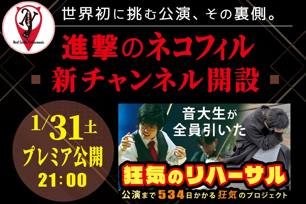 2026/01/30 11:34このたび、2026年3月15日 ネコフィル特別公演をより深く、より濃く楽しんでいただくために、YouTube新チャンネル 「進撃のネコフィル」 を開設しました。【明日21時公開】1月31日21:00 プレミア公開 オケの命運をかけた世界初の挑戦『展覧会の絵』転生プロジェクトの全貌↓URLhttps://youtu.be/lP88xBvzXB4?si=F2PFGpUjTdrdjA9uこのコンサートは、クラウドファンディングで支えてくださった皆さまの存在があってこそ、実現できる舞台です。だからこそ私たちは、「当日聴く」だけで終わらない、物語を共有し、客席とステージが一体になる公演にしたいと考えています。このチャンネルでは、・この公演にかける思い・40人の“鬼才”たちの舞台裏、悪戦苦闘のリハーサル・ここに至るまでのストーリーを、少しずつお届けしていきます。背景を知って聴く音楽は、きっと違う。当日、会場にいる皆さまとネコフィルが「同じ瞬間の感動」を味わえたら嬉しいです。■ 3月15日(日)ネコフィル特別公演『Re:Play&Conduct』 たくさんのご予約、本当にありがとうございます!↓URLhttps://share.google/0fANumXbQcXMAEkco予想以上の反響をいただき、お席が残り少なくなってきました。この挑戦を一緒に育ててくださっている皆さまと、3月15日、最高の瞬間を共有できることを心から楽しみにしています。引き続き、どうぞ「進撃のネコフィル」を見守ってください。 もっと見る