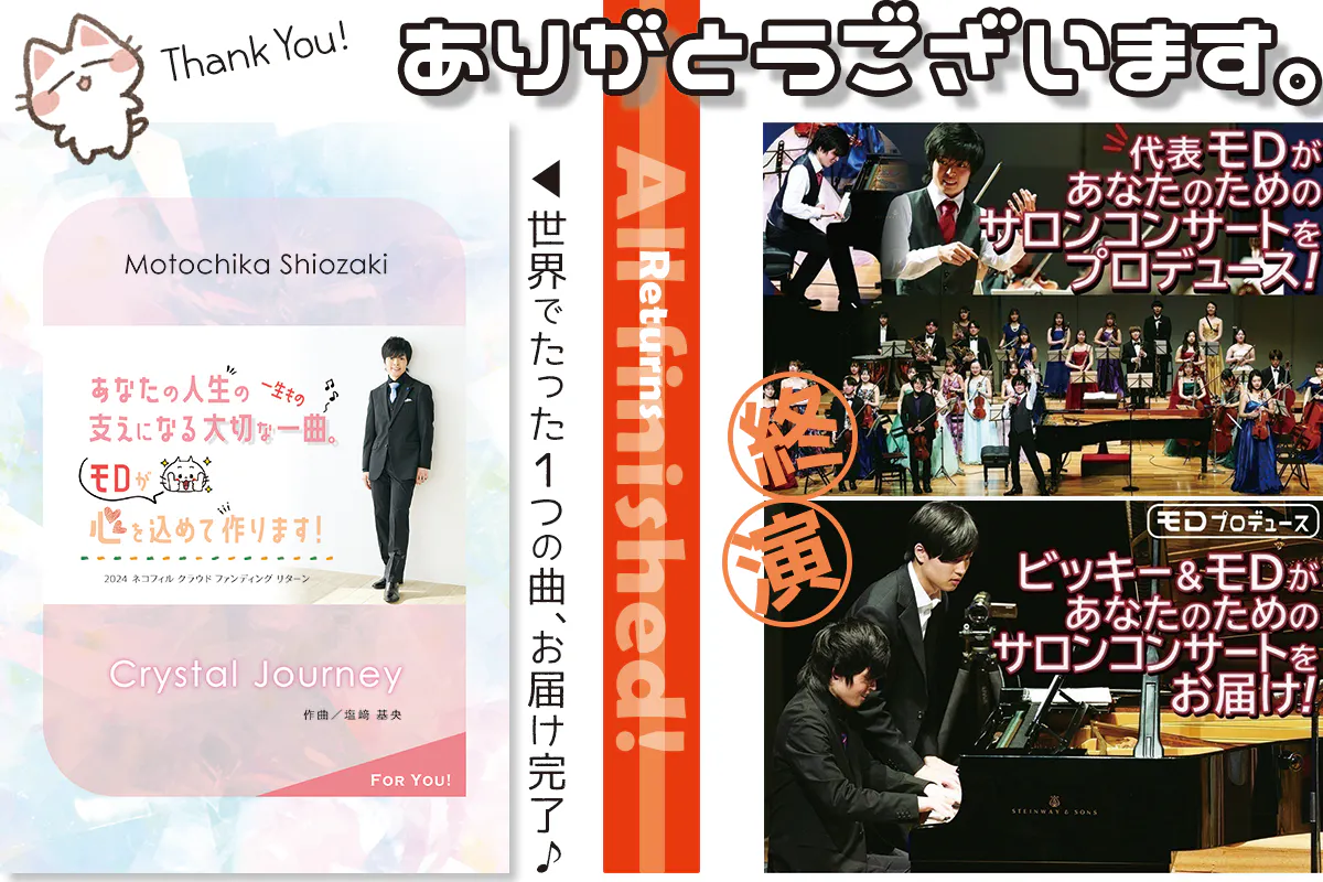 〈4月リターン〉特別限定企画:モDがあなたのために世界で1つのオリジナル楽曲を作曲!直筆楽譜PDF&モDによる曲の聴きどころ解説動画をお届け! のリターンをお届け完了いたしました。