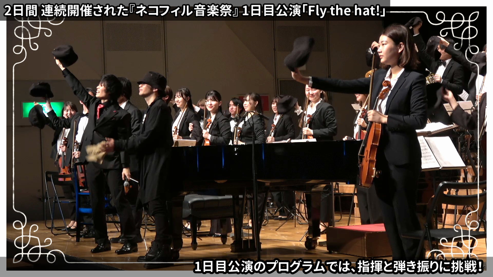 1日目『ネコフィル Fly the hat!』特別ゲスト菊池亮太さんやホールいっぱいのお客様と共に、ネコフィル全員でオリジナルハットを天にかかげる"Fly the hat!"がついに実現しました!最後はスタンディングオベーション&ブラボーの嵐で最高に白熱しました!本演奏会のご来場をきっかけに本クラファンの存在を知っていただき、ご支援していただいた方も多くいらっしゃいました。沢山のご来場と応援、本当にありがとうございます!2日目『童話アートな音楽空間』 視覚・聴覚・触覚の3つの感覚でお楽しみいただく、新感覚&最先端オリジナルアート「Try! Art」への挑戦! 実は、生演奏と映像を合わせるのは至難の技! 満席のお客様に見守られ、ついにアート作品が実現! 沢山のお客様に私たちの新アートを体験していただけました! 情熱大陸やアメイジング・グレイスなど、数々の名曲たちをお子様から大人の方までお楽しみいただきました! トップパートナー企業「クラウティ」様、プロジェクションマッピング制作団体「SHADECOR」様、ありがとうございました!本クラファンの目標達成まであと少しです!いつも多大なご支援をありがとうございます!引き続き、どうぞよろしくお願いいたします。