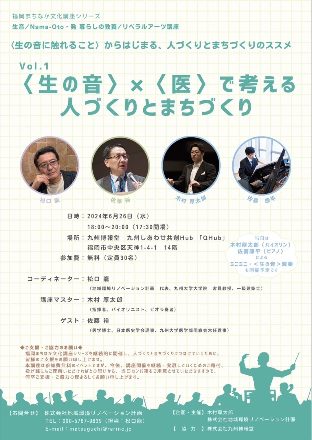 暮らしの教養/リベラルアーツ講座 <生の音に触れること>からはじまる、人づくりとまちづくりのススメ ■講座企画のきっかけは? 古代ギリシアで生まれた概念のひとつに、「リベラルアーツ/一般教養」があります。 その概念は、言語系 3学(文法・論理・修辞)と数学系 4 学(算術・幾何・天文・音楽)の計7科で構成されるものと定義されました。「音楽」もその科目のひとつとして位置付けられています。 技術が猛烈な勢いで革新していく日々にあって、今、改めて「リベラルアーツ/一般教養」に眼を向けて、皆さんで一緒に考えてみることで、私たちの日々の暮らしはより豊かなものにできないものでしょうか? 「リベラルアーツ/一般教養」に改めて眼を向けて私たちの日常の暮らしについて考えてみることの大切さって何? <生の音に触れること>の効用って何?指揮者として国内外で活動を展開している木村厚太郎さんのこのような問題意識と問いがきっかけとなって、本「まちなか 文化講座シリーズ」は企画されました。 ■講座のテーマは? 本講座は、講座マスターを指揮者木村厚太郎さんにお願いし、「生の音に触れること」を軸にして様々な視点からテーマを設けて、毎回ゲストをお招きし、生演奏のパフォーマンスを講座の導入にして語り合いの場をもち、会場の方々とのコミュニケーションを通じて、参加者みんなでこれからの人づくりとまちづくりについて考えていきたいと思います。 講座シリーズの各回テーマの候補イメージ・<生の音>×<医>で考える、人づくりとまちづくり・<生の音>×<食>で考える、人づくりとまちづくり・<生の音>×<住>で考える、人づくりとまちづくり・<生の音>×<脳科学>で考える、人づくりとまちづくり ・<生の音>×<ジェロントロジー>で考える、人づくりとまちづくり ・<生の音>×<まちづくり>で考える、人づくりとまちづくり ・<生の音>×<コミュニティ>で考える、人づくりとまちづくり ・<生の音>×<子育て>で考える、人づくりとまちづくり ・<生の音>×<教育>で考える、人づくりとまちづくり ・<生の音>×<大学>で考える、人づくりとまちづくり ■Vol, 1 <生の音>×<医>で考える、人づくりとまちづくり■日時 2024年6月26日(水) 18:00~20:00 (17:30開場)■場所 九州博報堂 九州しあわせ共創Hub 「QHub」 福岡市中央区天神1-4-1 14階■講座マスター 木村厚太郎 (指揮者、ヴァイオリニスト、ヴィオラ奏者) ■ゲスト ・佐藤裕(医学博士、元・九州大学医学部第一外科、九州大学医学部同窓会常任理事) ・松口龍 (地域環境リノベーション計画 代表、九州大学大学院 客員教授、一級建築士) ■主催・企画・ 株式会社地域環境リノベーション計画 ■お問合せ 090-5767-9839 (担当:松口龍)■協力 株式会社九州博報堂 皆様、是非お越しください♪