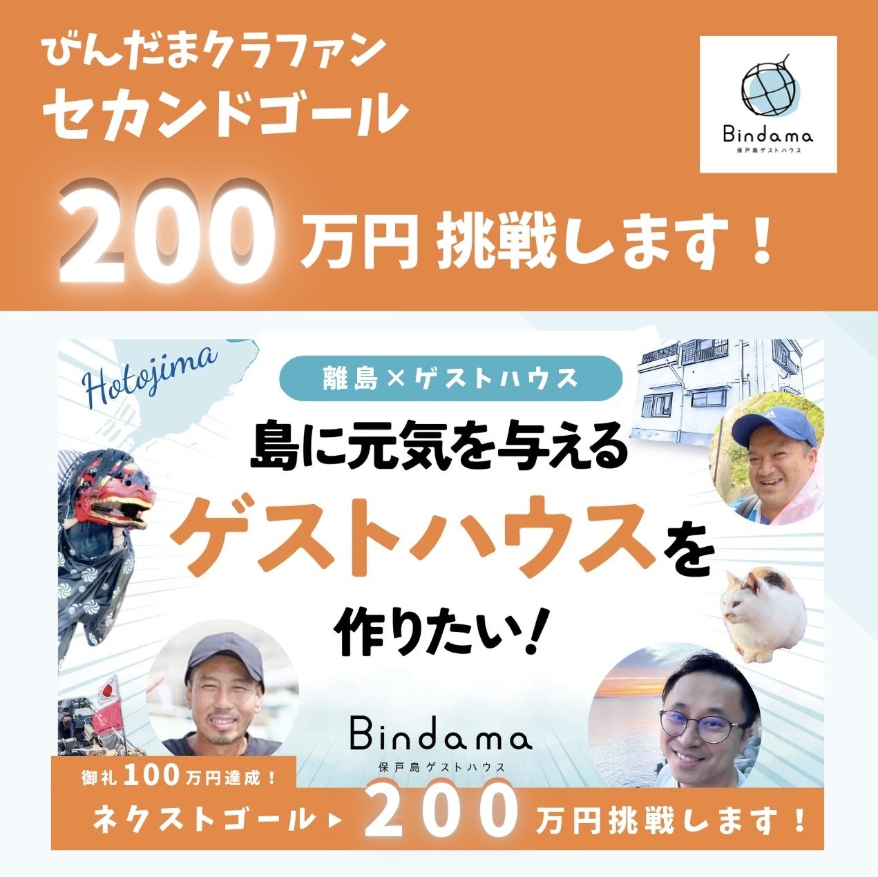保戸島Bindama のクラウドファンディング3日で目標達成いたしましたが、また新たにびんだまはセカンドゴールとして、200万円の目標を掲げました!好評につき無くなっていたリターンも追加されております!(追加報告を先日しましたが、反映されておらず申し訳ありませんでした。)