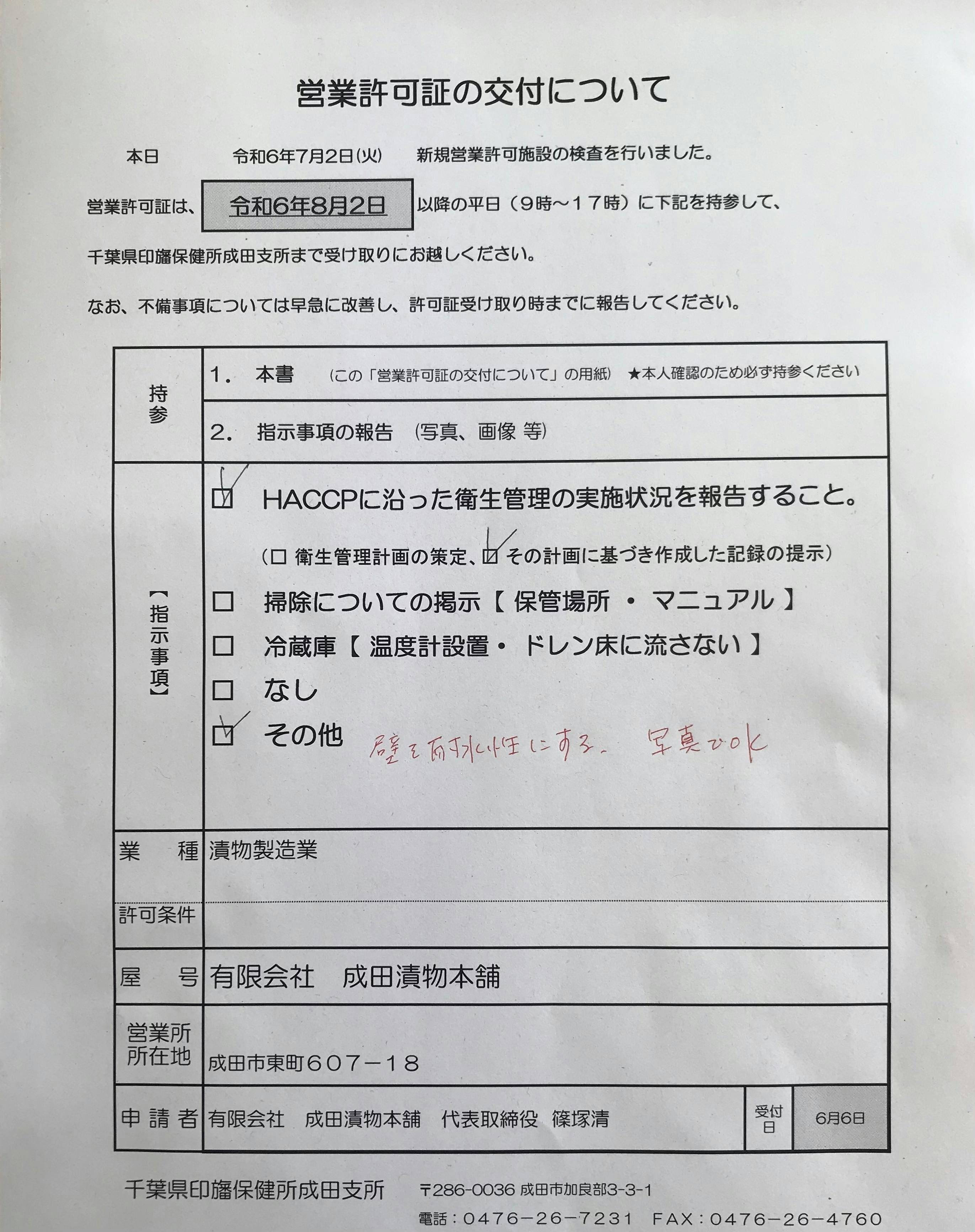 2024/07/02 14:07若干手直しが必要ですが、検査が通りました。8月に営業許可証が交付されます。これで漬物の製造が再開できます。皆様のおかげです。本当に感謝申し上げます。許可証は8月に交付され、製造再開は今日からOKとなりますが、きちんと全て整ってから再開致します。 もっと見る