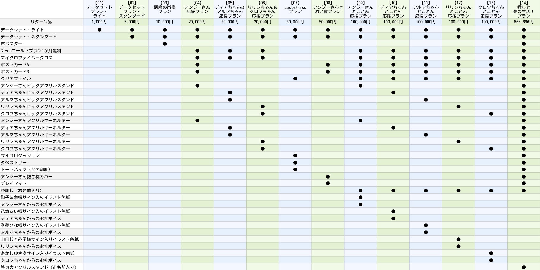 ■コースごとのリターン品一覧表