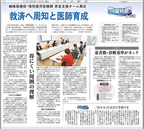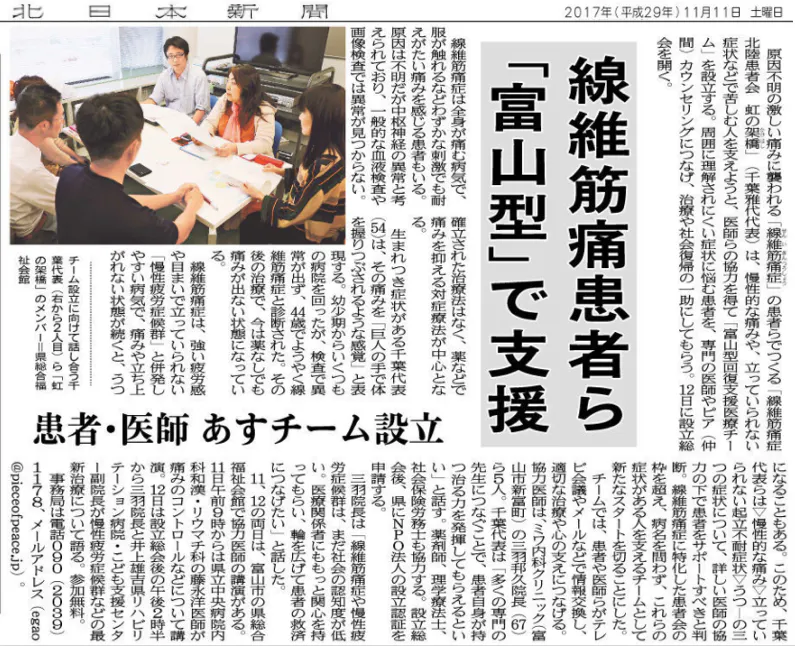 線維筋痛症と慢性疲労症候群を診断・治療して下さる医師が一人でも多くなり、全国で支援の輪が出来て、今まで以上に疾患や患者さんの実情を知っていただけるよう、「富山発」の情報発信によって全国に支援の輪が広がることを実現したいです。