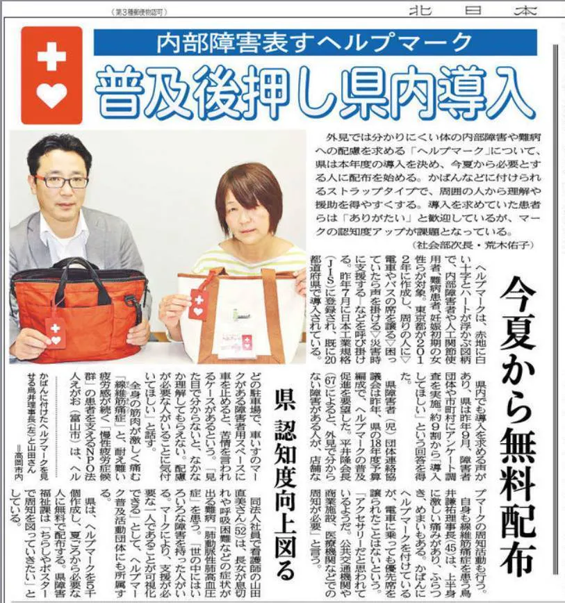 線維筋痛症や慢性疲労症候群のように、傍目からわかりにくい症状を持つ様々な疾病に悩む方々と共同で、「ヘルプマーク」の普及にも積極的に取り組んでいます。