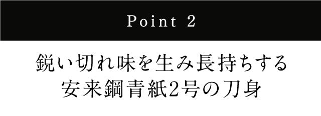 ②刃金にタフで切れ味が持続する安来鋼青紙2号を採用。地金に錆びにくくメンテナンスも楽なステンレス