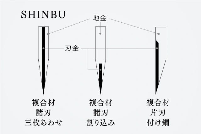 【SHINBU】は日本刀を作る技術を応用した鋼となる安来鋼青紙2号(以下、青紙2号)を地金のステンレスで挟み込んだ「本三枚造り」です。