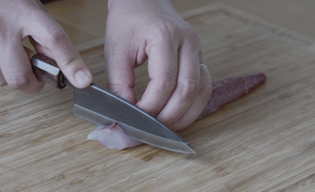 【SHINBU】は魚の肉を骨から剥がすのが得意な包丁なので、肉切り包丁としても威力を発揮。