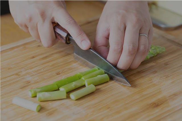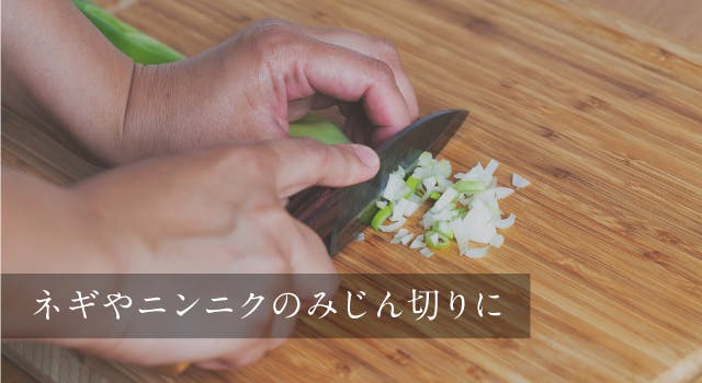 長ネギやニンニク、ショウガなど薬味のみじん切りも、指先の延長線のように使える小ぶりな【SHINBU】なら楽々。