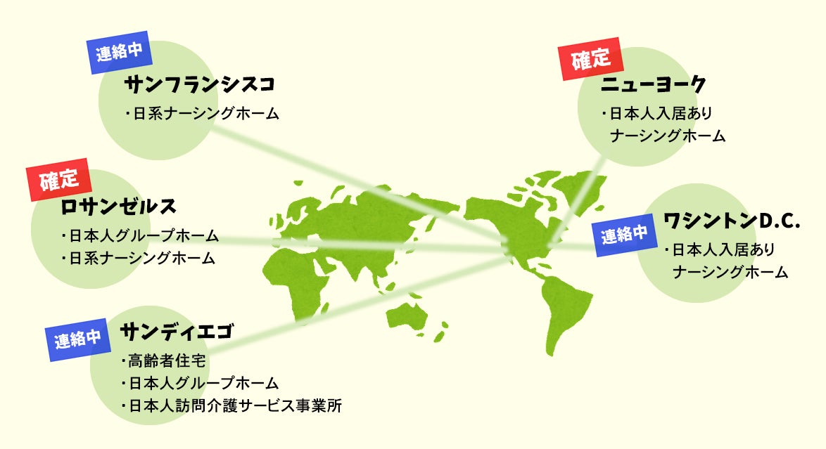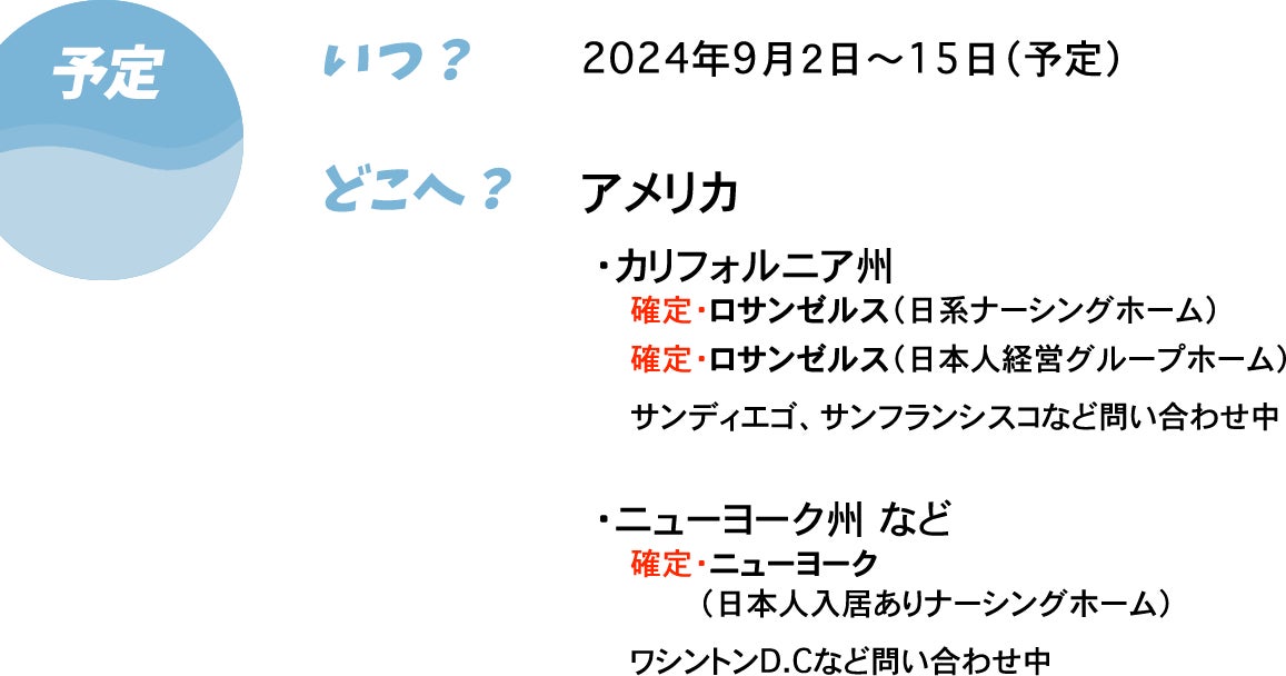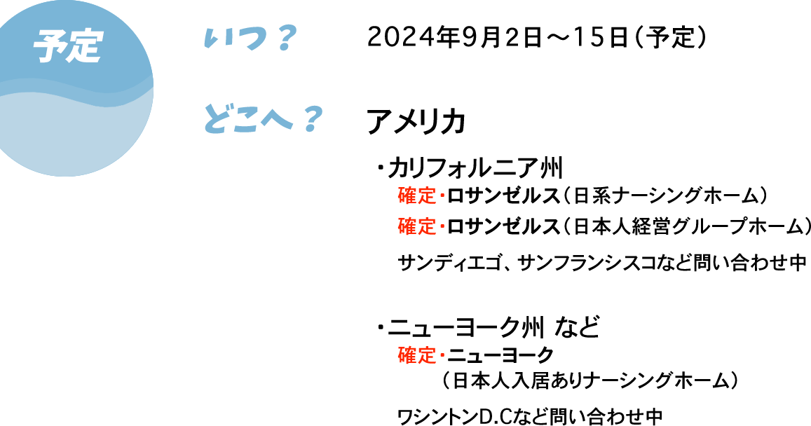 2週間ほどの滞在中に、ロサンゼルス、ニューヨークなど10ヶ所ほどの施設を訪問して、アメリカ在住期間のながーーーい日本人高齢者の合計200人以上のみなさんに「特別な1日」をお届けしたい!!!