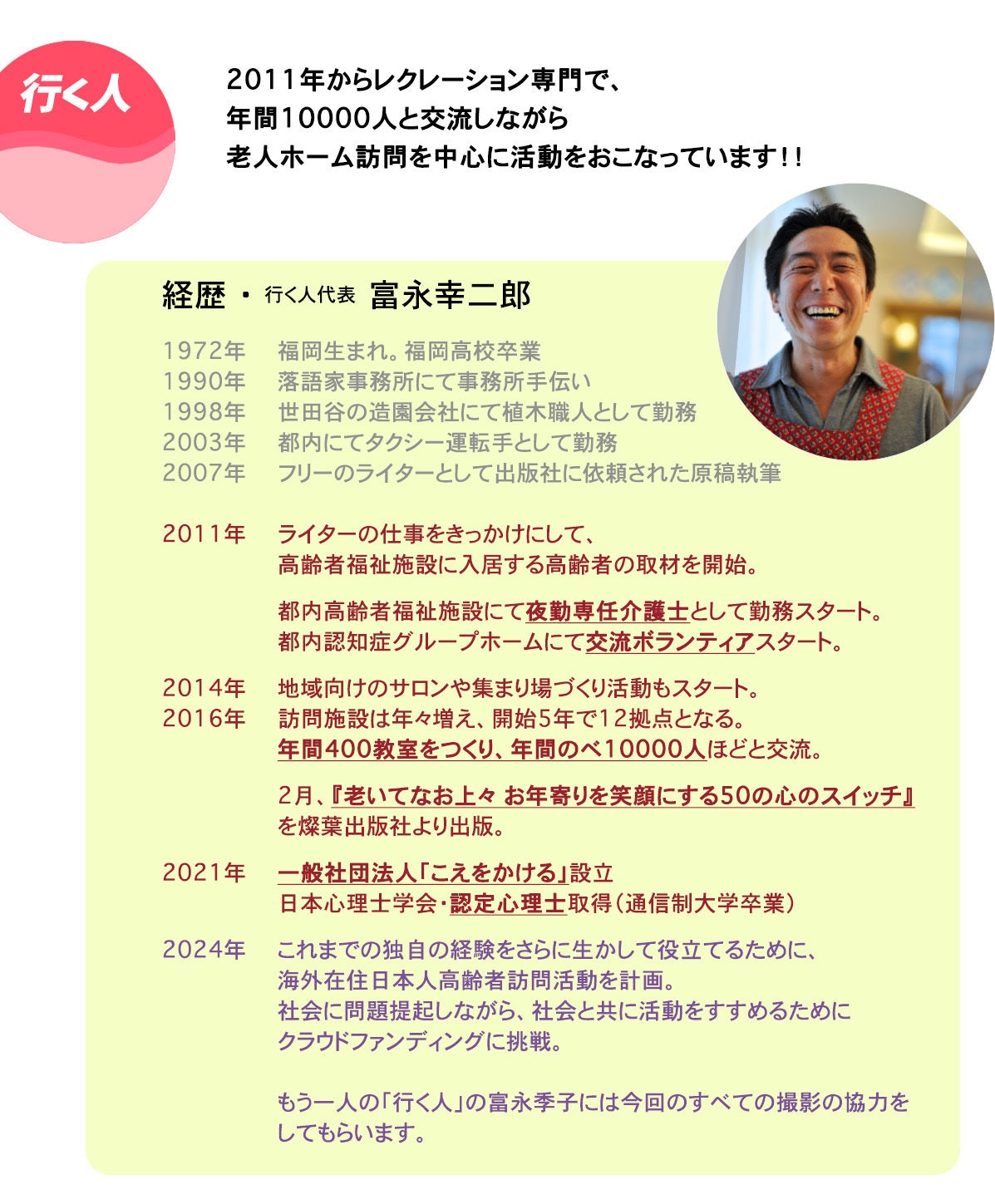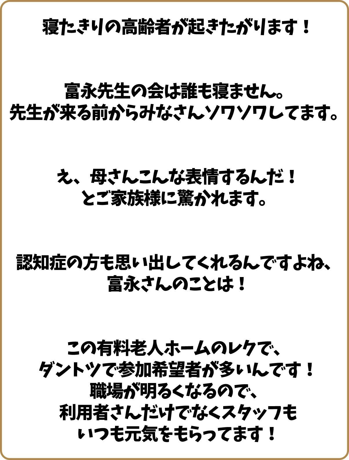 私は老人ホームを訪問して、高齢者向けのレクレーションをおこなっている富永幸二郎と申します。
