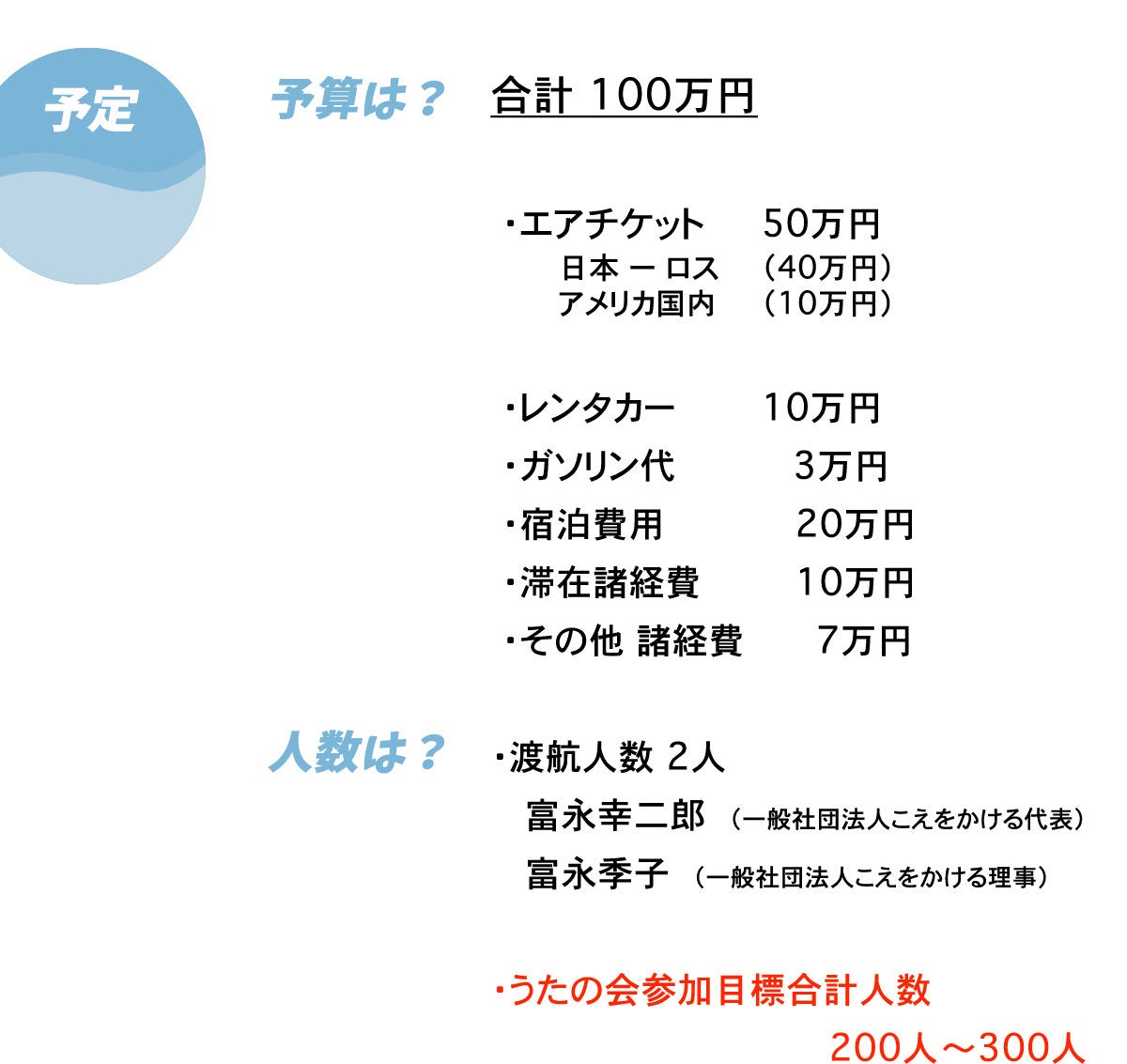 2024/06/29 11:32【今日、明日でクラファン終了です! ご寄付総額・ラジオ体操について】<ご支援額>いつもご支援ありがとうございます。クラファン起案者の富永です。現時点でのご支援の総額が582500円となりました!このサイトだけでだく、直接のご寄付などを含めた額となります。みなさん、本当にありがとうございます!<ラジオ体操 in USA の計画>今回のメインの目的は「在米日本人高齢者に日本語の交流レクレーションを届ける」ことです。訪問するのはおもにアメリカにある老人ホームなどになります。ただそれだけでは、オープンではない場所でおこなうだけで、その活動や意味が誰にも伝わらないで終わってしまうかもしれません。(ライブ中継も企画してますが、どこまで実現可能かはいまはまだ50%-50%です!)そこで考えました!活動を現地のみなさんや日本のみなさんに伝えるため、余った時間などを利用しながら、アメリカでラジオ体操をしたいと思っています。ラジオ体操は毎週葉山で40人くらいとやってますし、指導員の資格者もおります!それはガンガンライブ中継いたします!時差は関係なく、どんどん生中継して、できれば日本の朝やいい時間に合わせて現地編集したラジオ体操を動画配信したいと考えています!とんな現地参加者が現れるか、いまから楽しみです!!<日程と決定済みの訪問先数>9月3日火 〜5日木 ハワイホノルル(2ヶ所)9月6日金〜8日日 サンディエゴ(3ヶ所)9月9日月 〜13日金 ロサンゼルス(2ヶ所) 9月14日土 〜18日水 ニューヨーク(1ヶ所)エアチケットはNYまで購入しました!すでに現地のいろいろな方とつながって、ご協力を得ながら計画を進めています!この2ヶ月でもっともっとつながりが増えそうです!!ああ、準備楽しい!!現地での時間が楽しみすぎる!!みなさんにもこのチャレンジを隅々までお届けするのが楽しみでなりません!! もっと見る