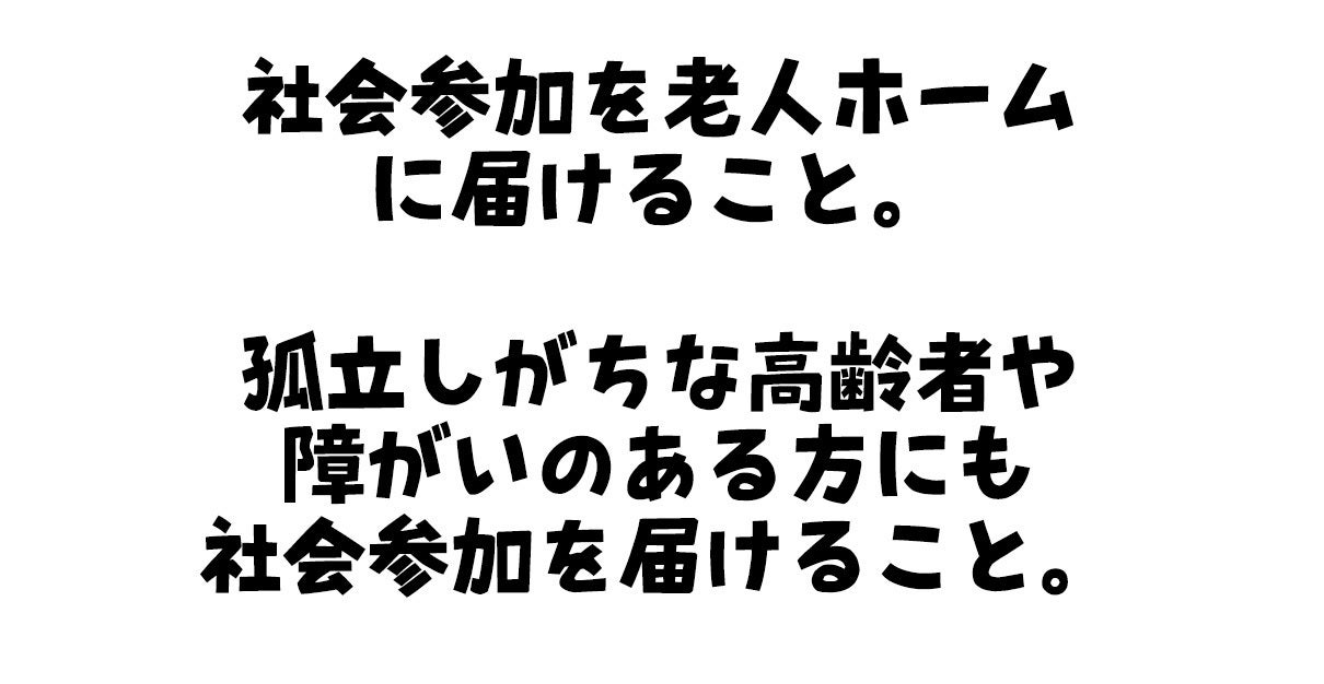 もし、食材を得るために歩けない人がいたならば、届ければいいことです。ならば、社会から遠く離れてしまった人がいたならば社会を届ければいいんです。