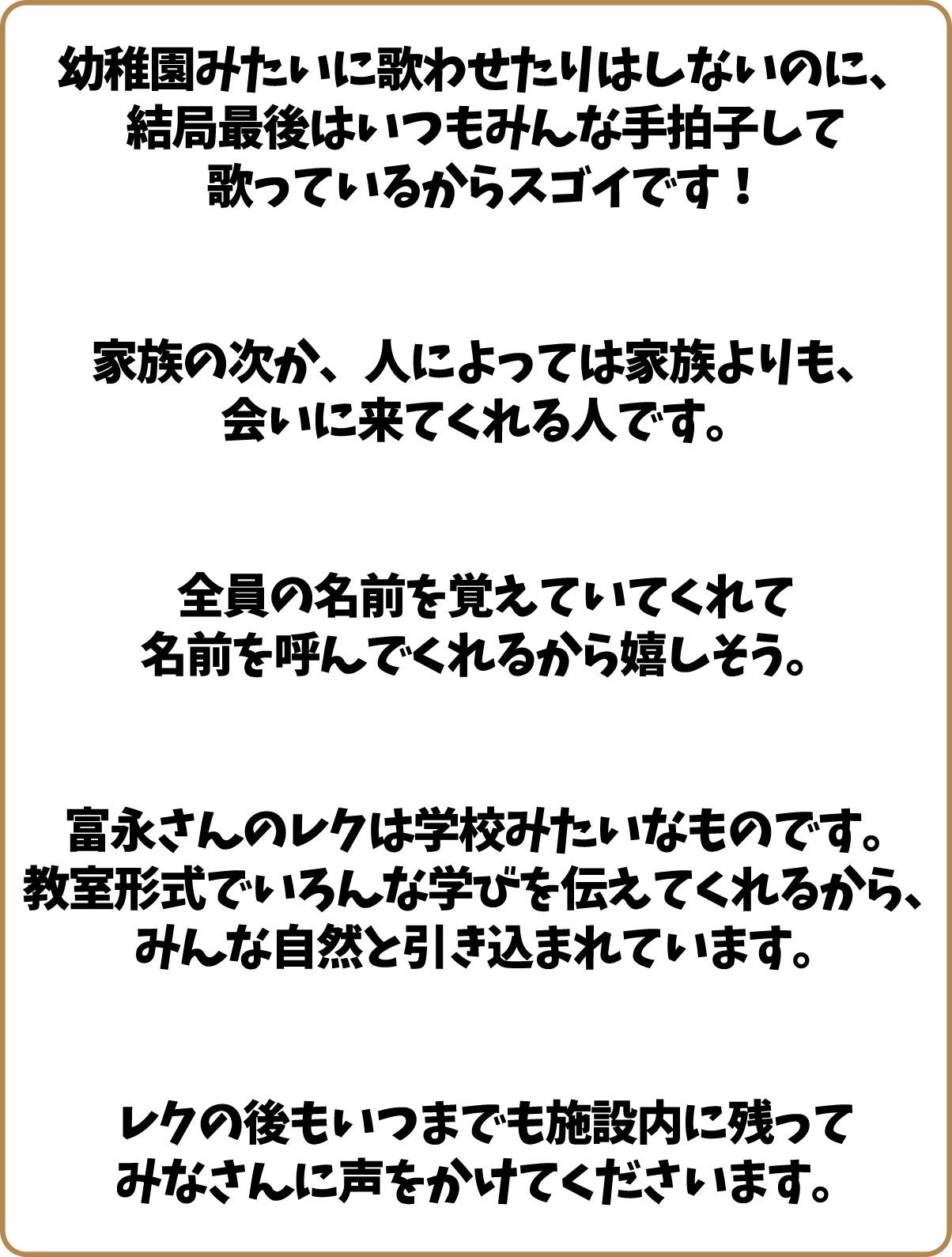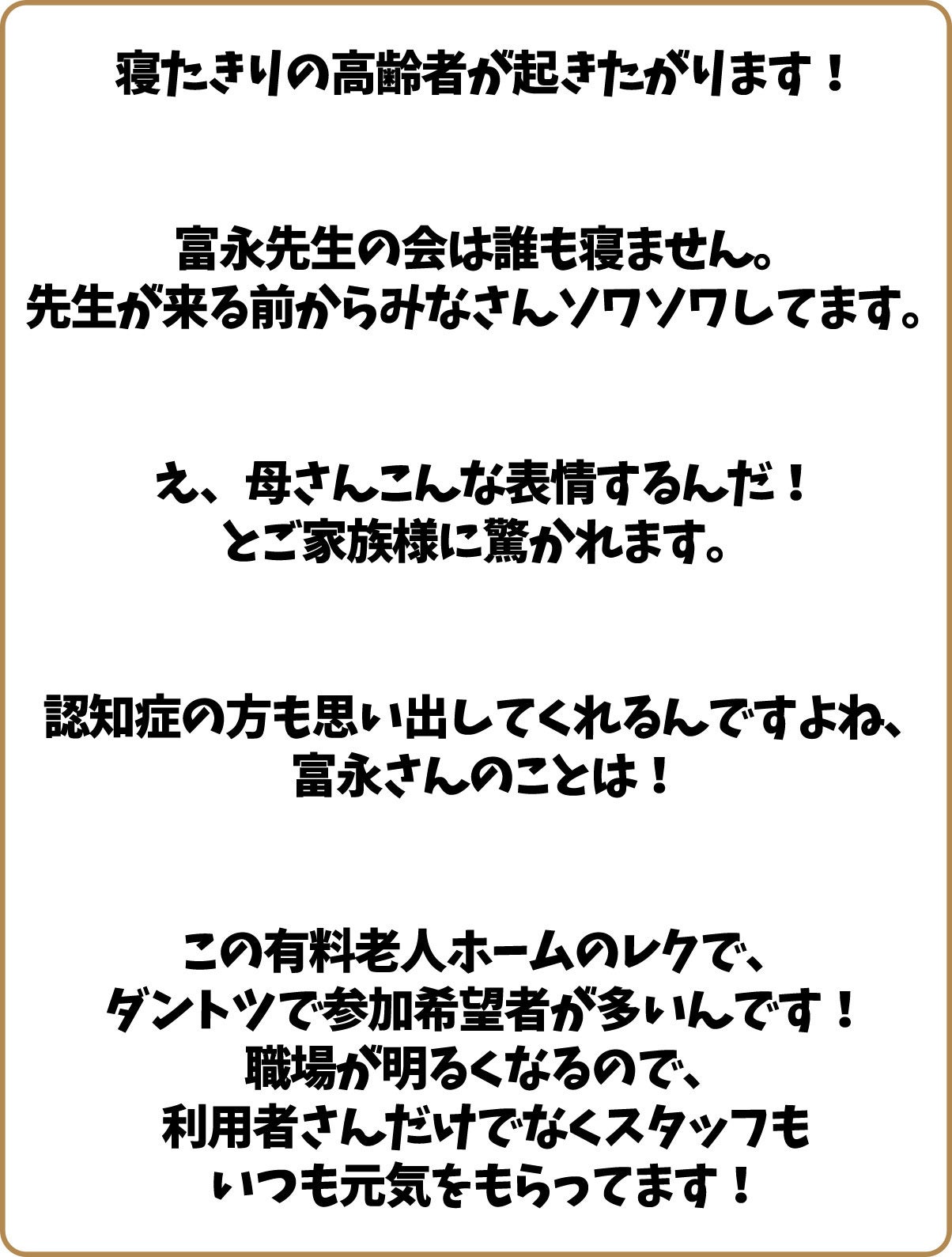 私のレクレーションについて、介護士のみなさんからは、こんなふうに言っていただけています。