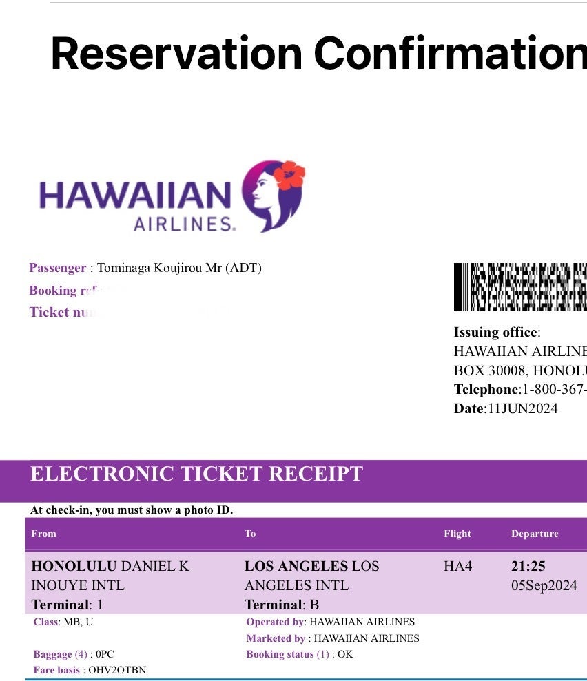 こちらは、HAWAIIAN AIRLINESのConfirmationです。