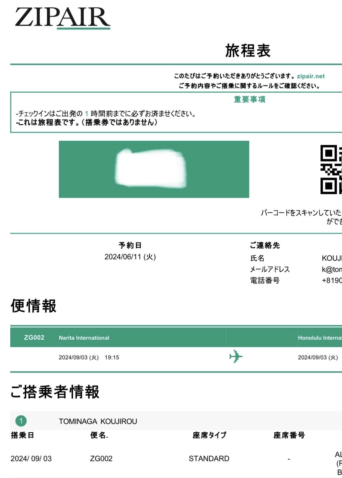 これは、JAL系のLCC、ZIPAIRのitineraryです。