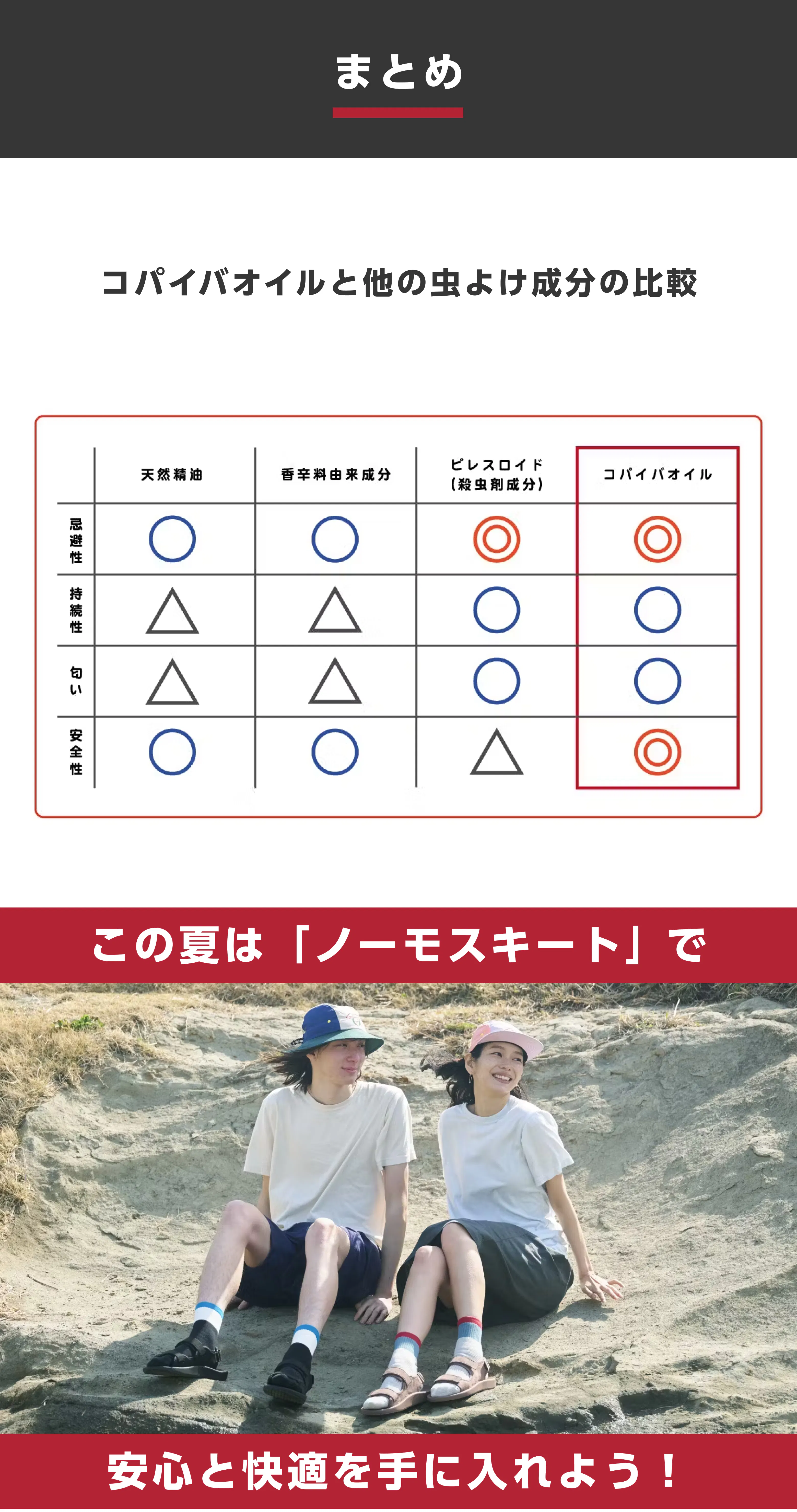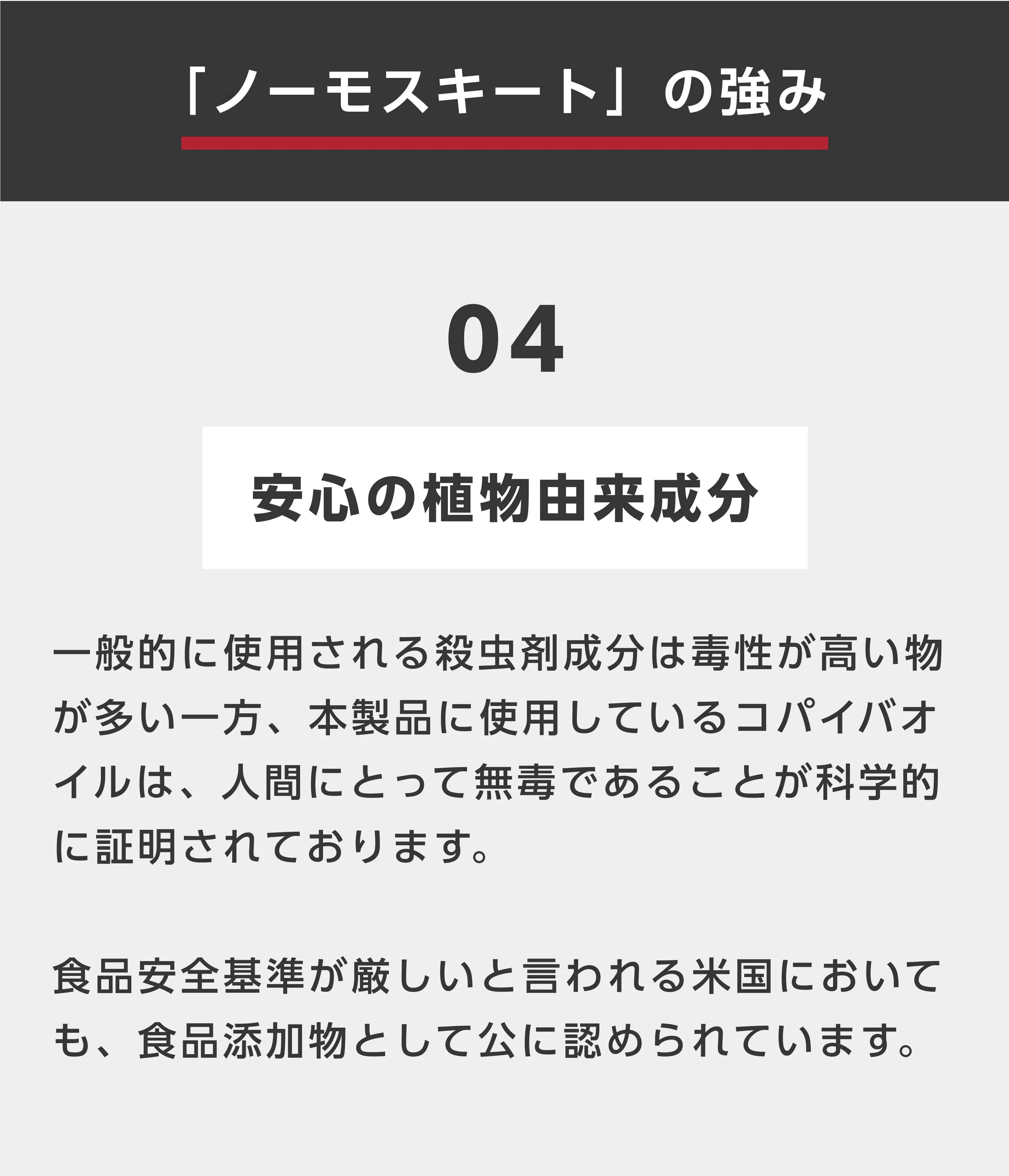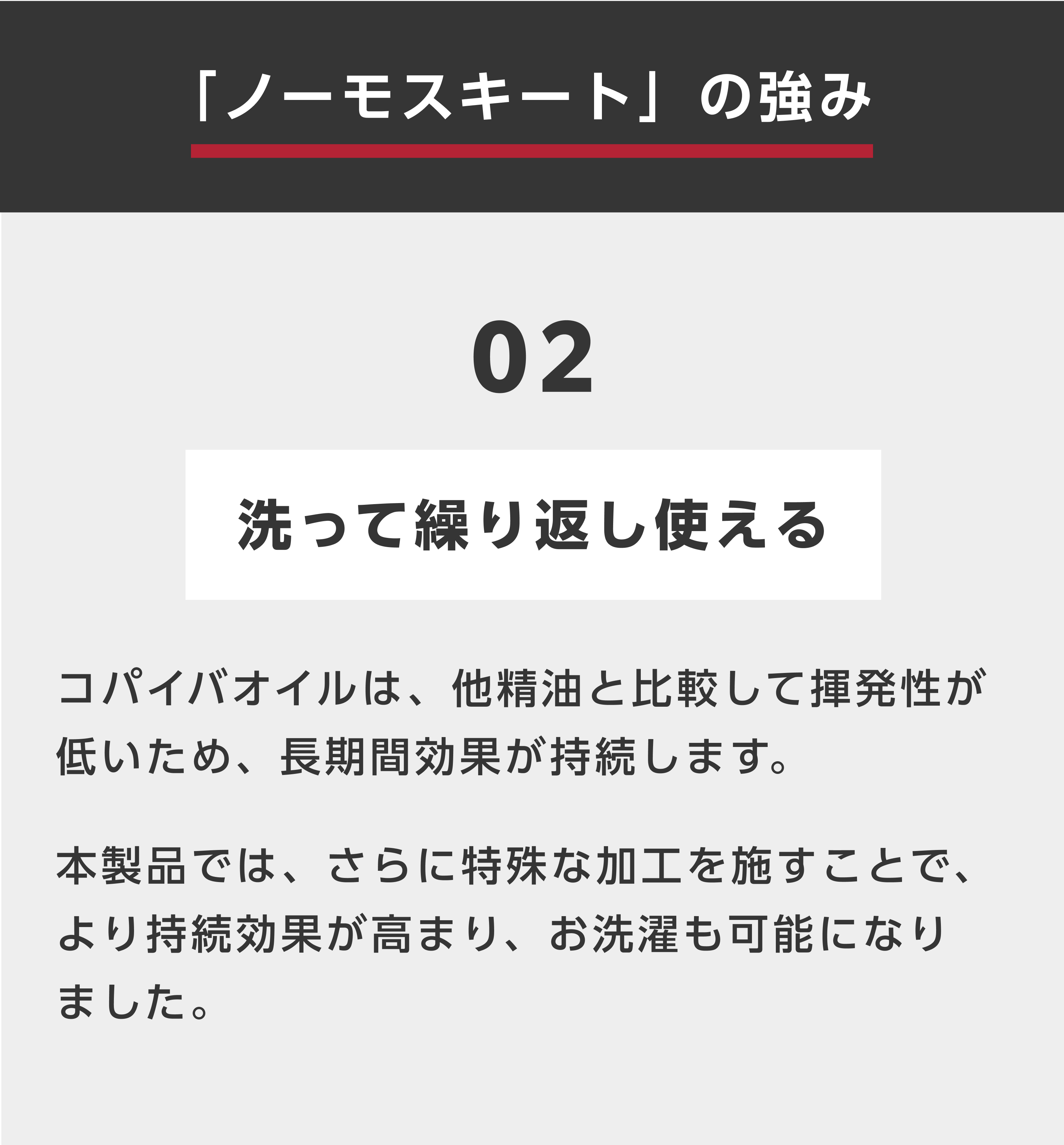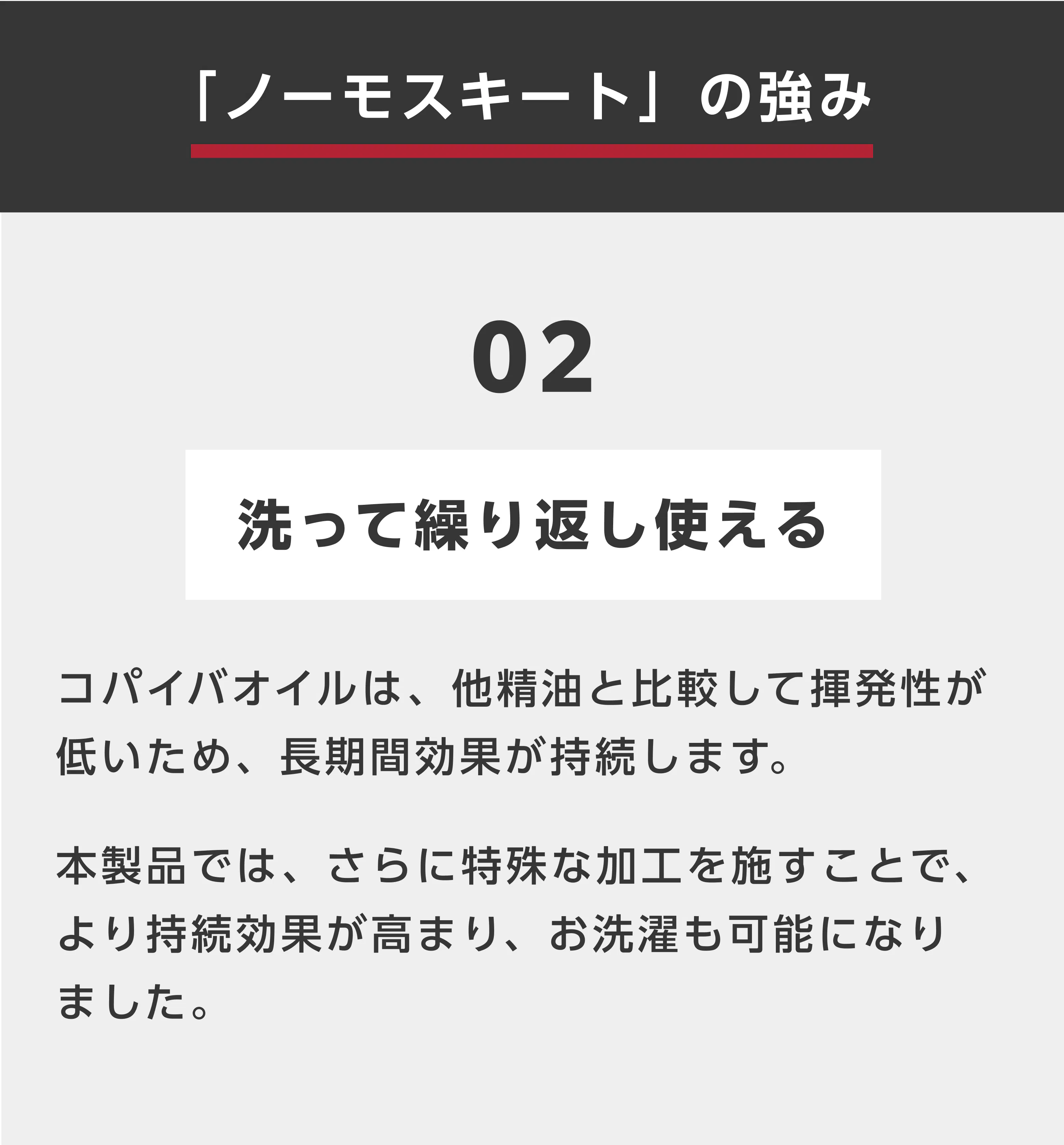 A1: 当製品はコパイバオイルを含む特殊加工を施しており、この自然由来の成分により蚊を寄せ付けない効果を発揮しています。