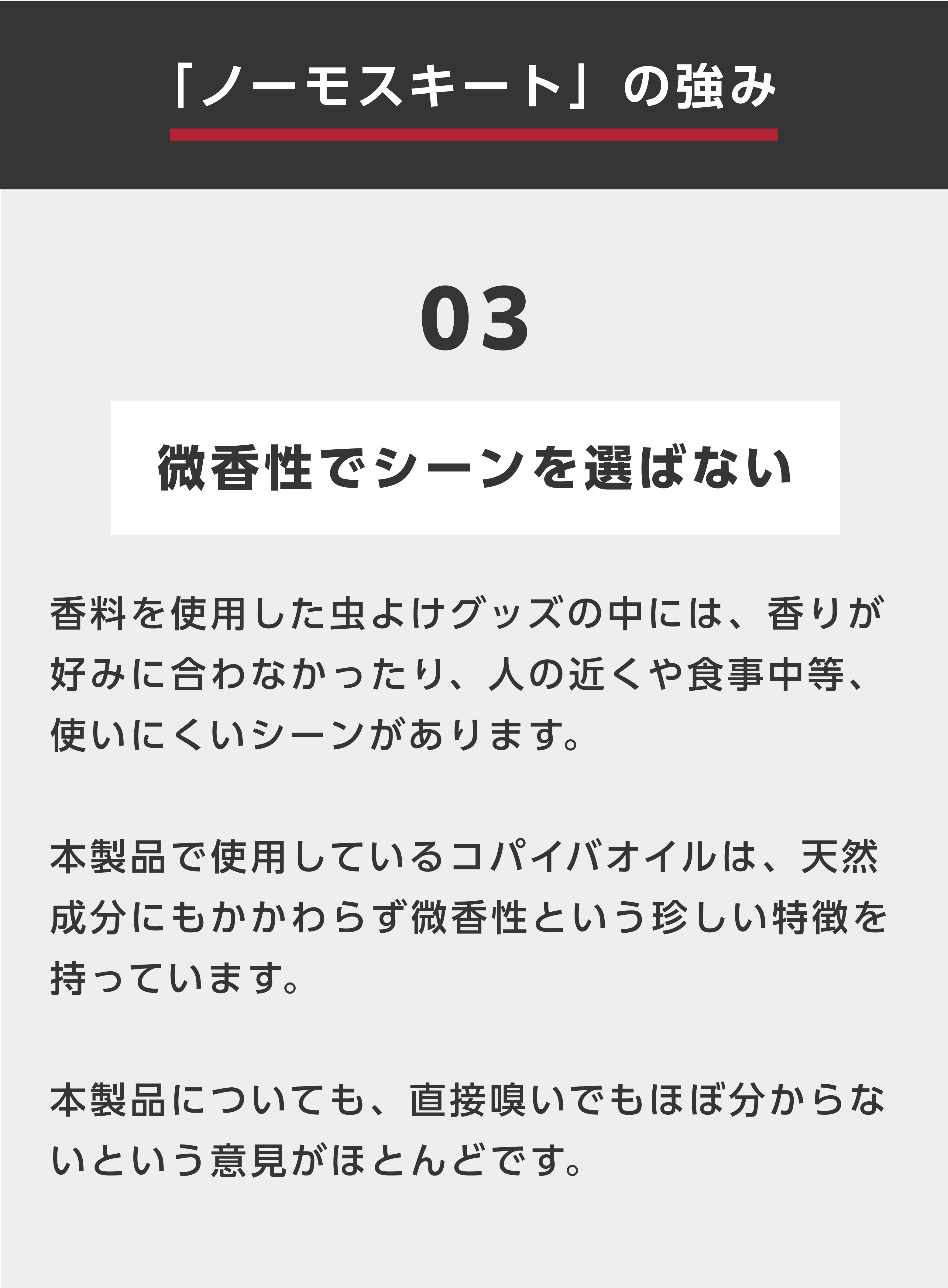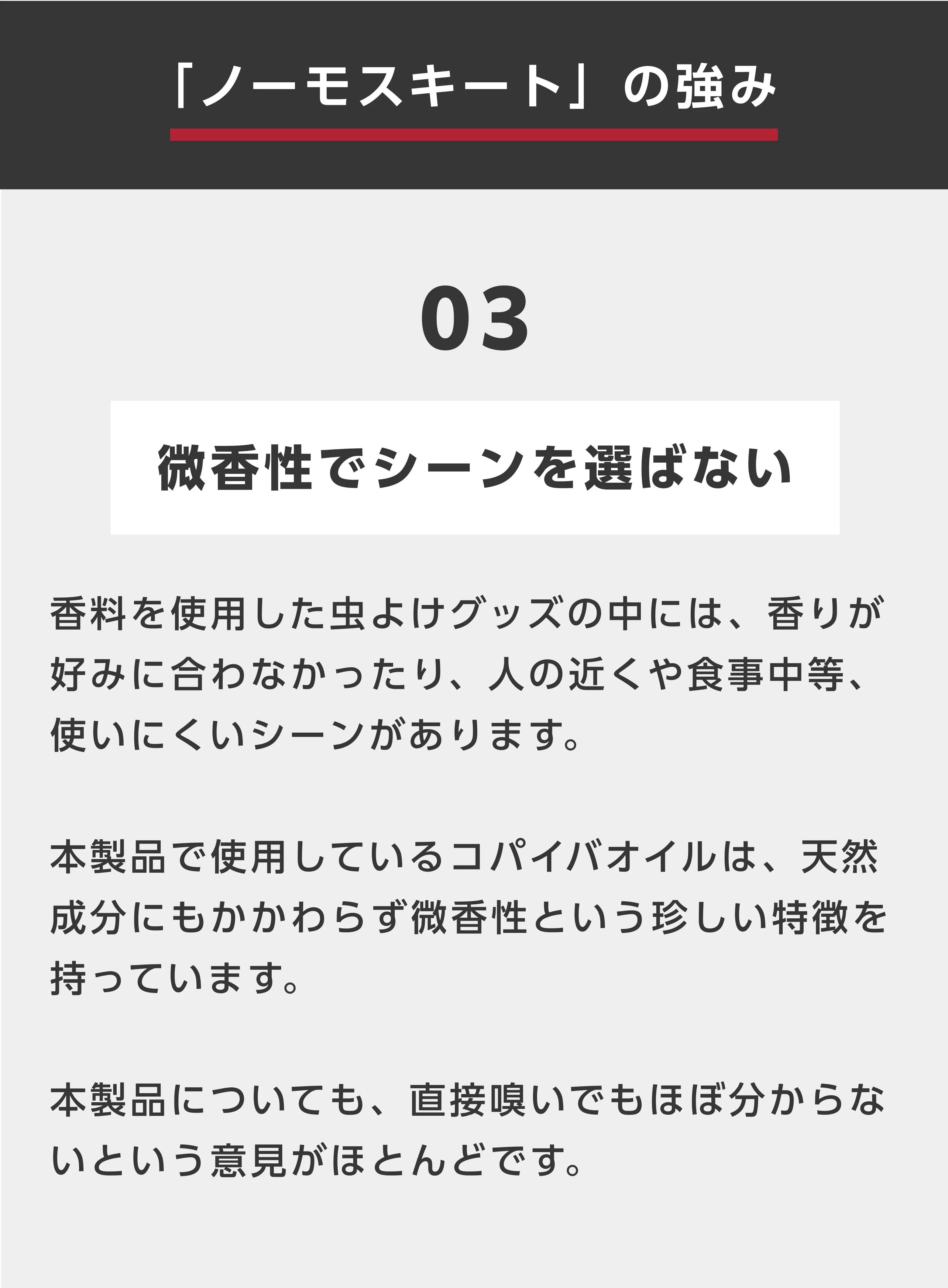 A4: 『ノーモスキート』は他の蚊よけ製品と比較して匂いが非常に少ないです。使用中、特有の強い匂いに悩まされることなく、屋内外で快適にご使用いただけます。