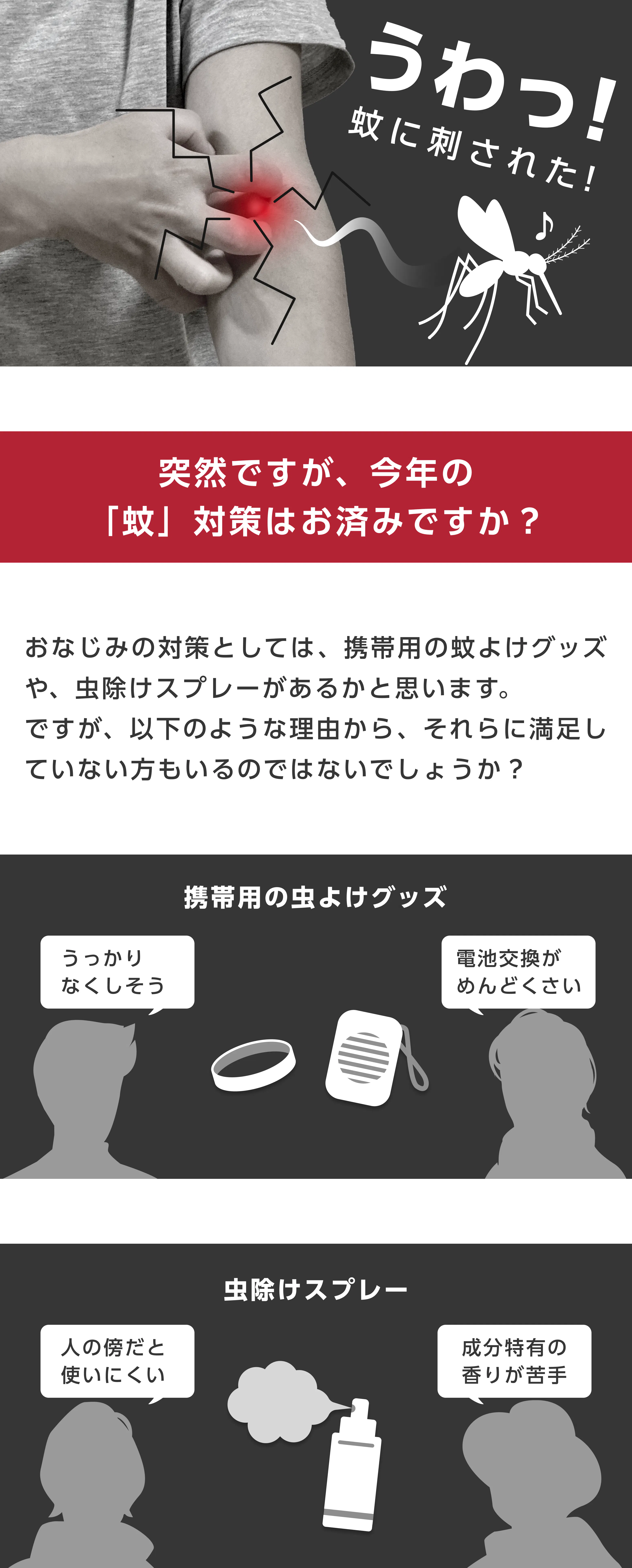 A5: 普段からの日常生活、アウトドア活動、フェス、キャンプ、ピクニック、夕暮れ時の散歩、庭仕事など、特に夏場の屋外での使用に最適です。蚊の多い環境での活動に特に有効で、家族全員での使用がおすすめです。