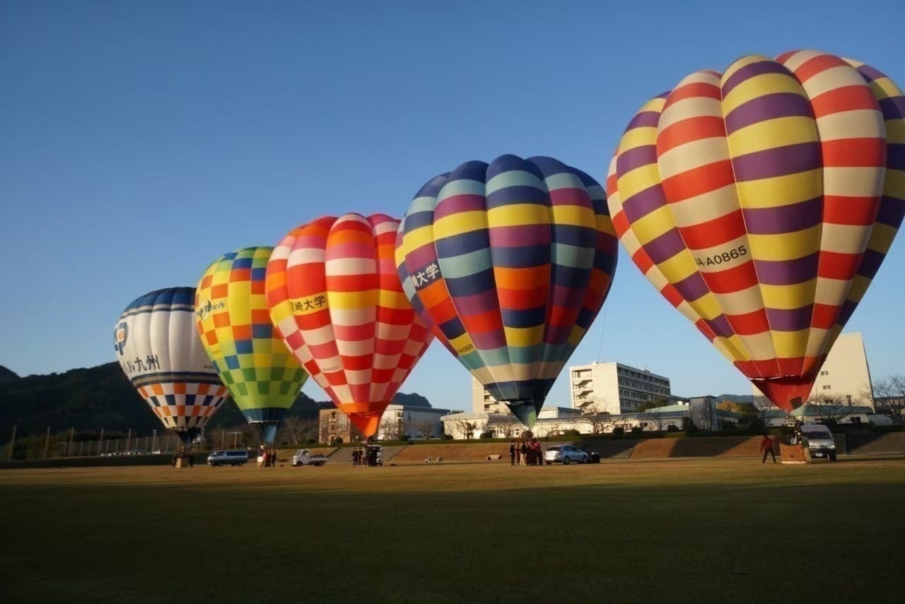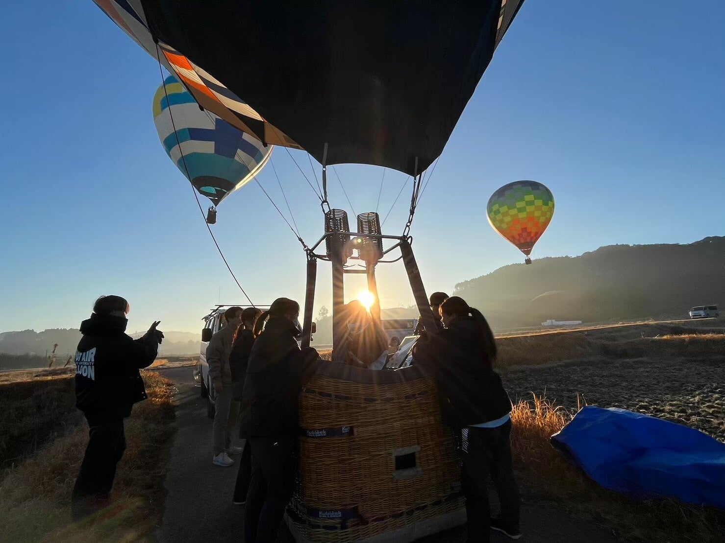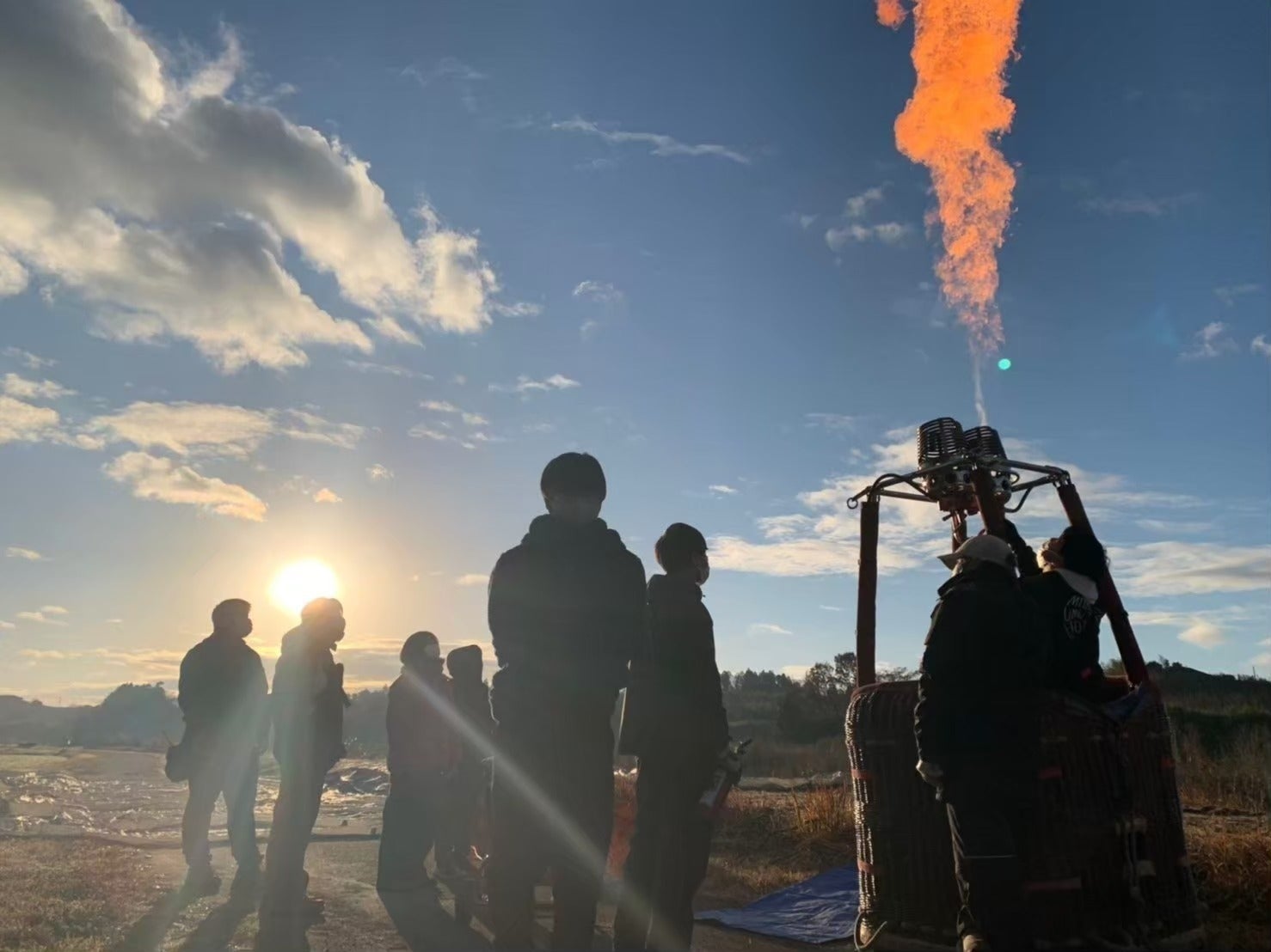日の出後の数時間、風が穏やかな時間帯にフライトを行います。そのため、宮崎大学のある宮崎市から都城までは車で1時間ほどかかる道のりを、日の出の1時間以上まえに大学に集合し都城に向かいます。都城の集合場所には宮大OBOGや気球関係者が集まりフライトを行っています。シーズン中、天気のいい日はほぼ毎日、地域の方々の支援もあり、元気に活動をしています。