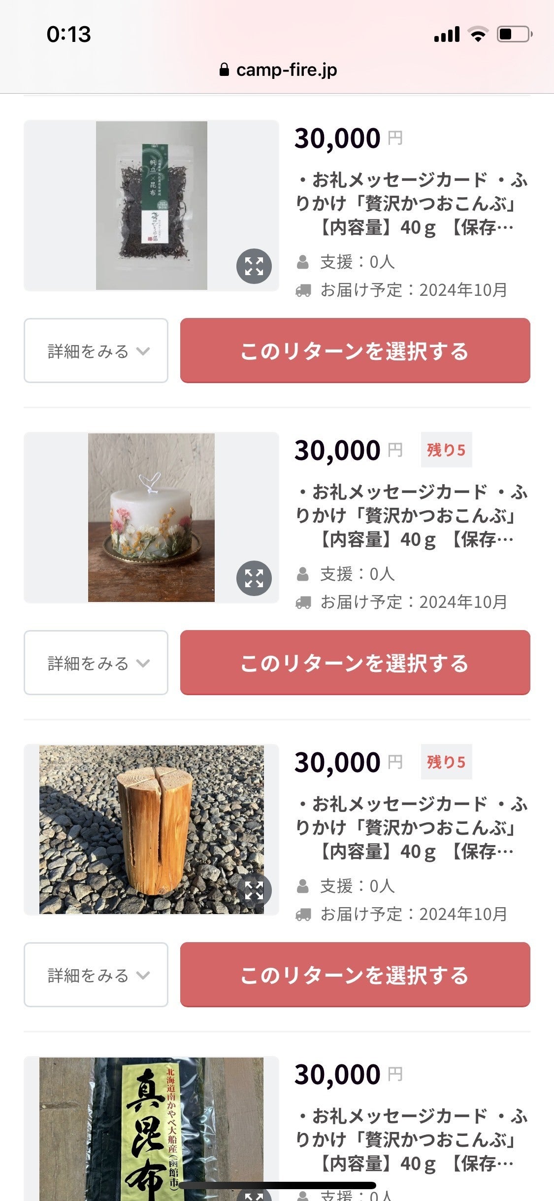 設定金額「30,000円」のリターンについてですが、トップページの説明を見ますとすべて同じ内容に思えるかもしれませんが、「ふりかけ」が基本すべてに含まれており、それに「キャンドル」や「ミニ・スウェーデントーチ」「出汁真昆布」などの組み合わせになっておりますので、お手数ですが「詳細をみる」(PCですと「もっとみる」)を押していただいて内容をご確認の上、お申込みください。