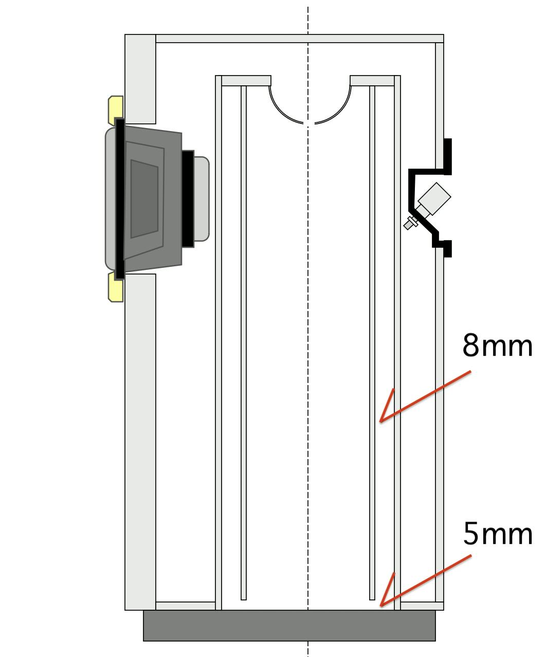 基本はダクトとダクトの間に、約4mmの隙間を設けるというものです。この隙間で、なぜが低音の音圧が上がります。もともとは、ダクトの歪を解消するために、トライしたものです。しかし、結果は全く予想もしない方向に、正解が見つかりました。