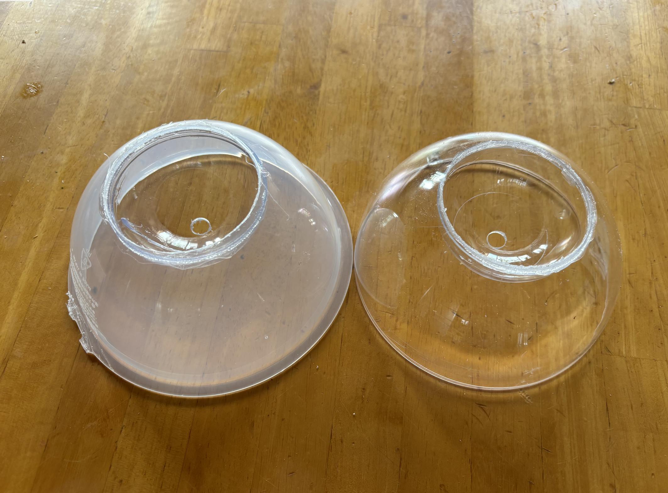 取り敢えず、使えそうなものから加工していきます。これも問題がありまして、ホールソーの歯が丁寧に加工しないと薄いアクリル・ドームは、壊れてしまいます。ここでも破損率が高いです。歯の数が少ないので、引っ掛かりが出来るようです。
