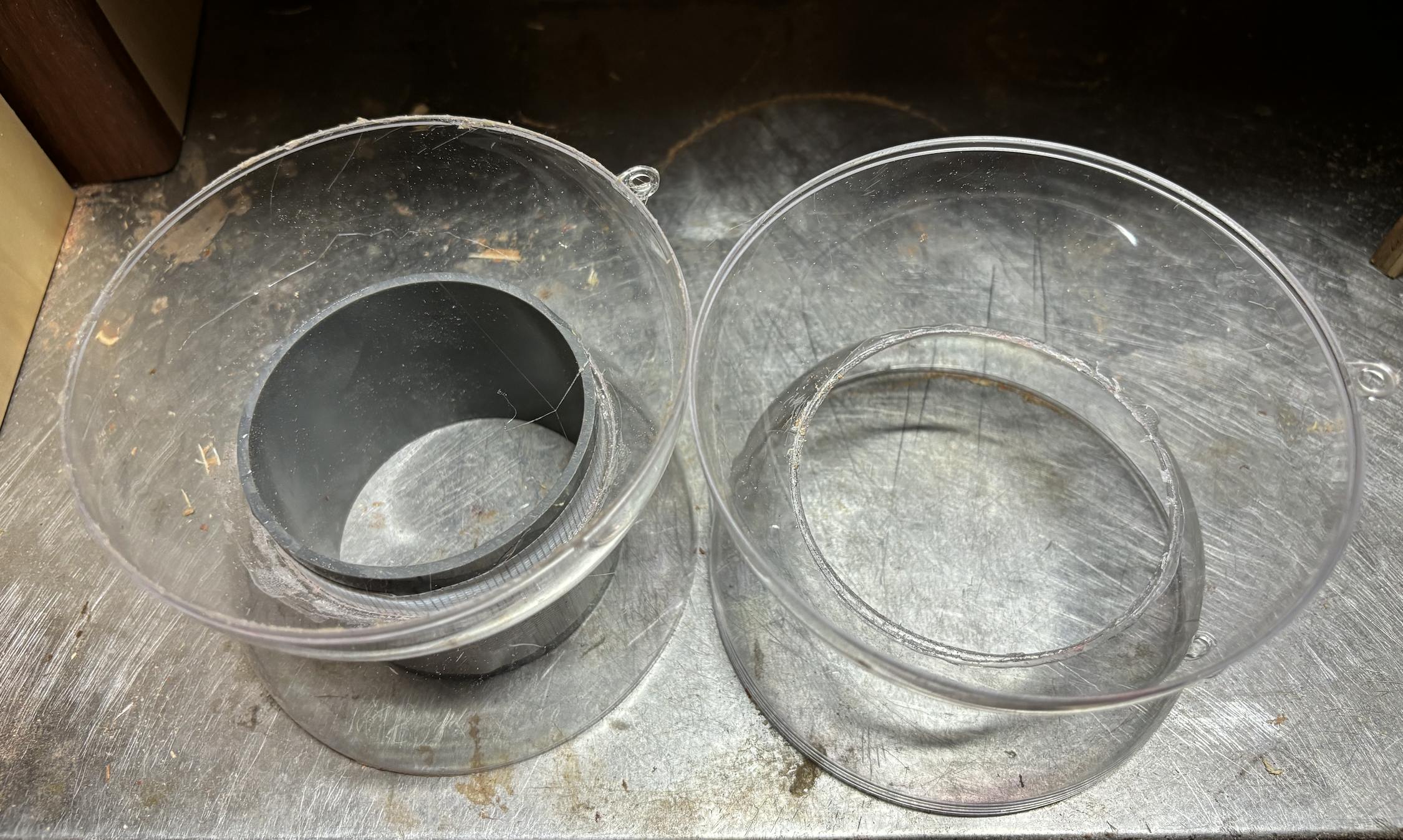 ダブルドームは、穴を80Φまで拡大しました。2つを上下から接着するのに、ずれないようにVU60のパイプをセットしています。少しガタつくので、テープを巻いてガタツキを抑えています。