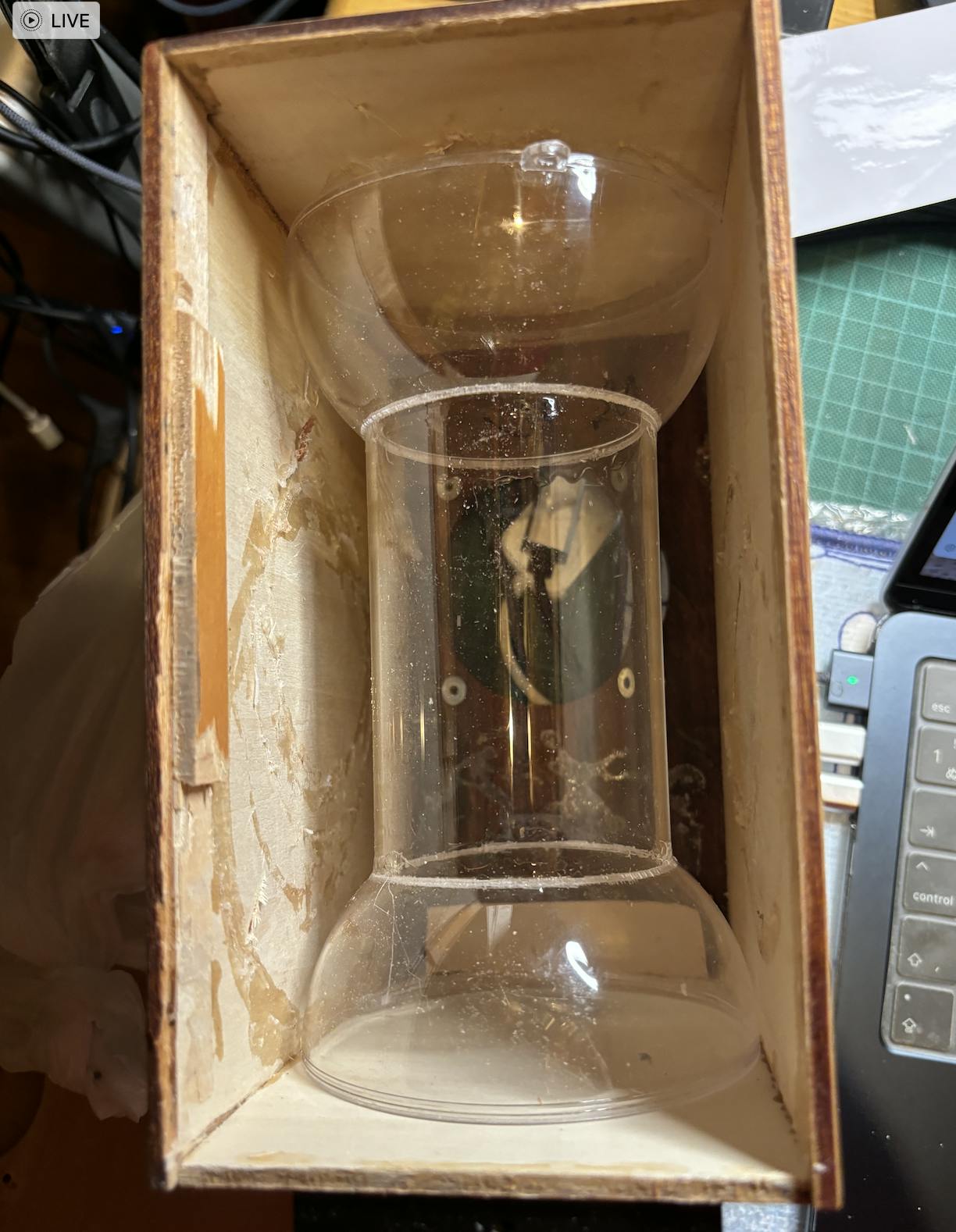 100Φのドームに、75Φの穴を開けます。この穴に75Φアクリル官を差し込みます。反対側にも100Φのドームに75Φの穴を開けたものに、、アクリル管を差し込みます。これを接着剤で、約半日間かけて固定します。見た感じは、ダンベルの様ですね。力強い音が出るかな???