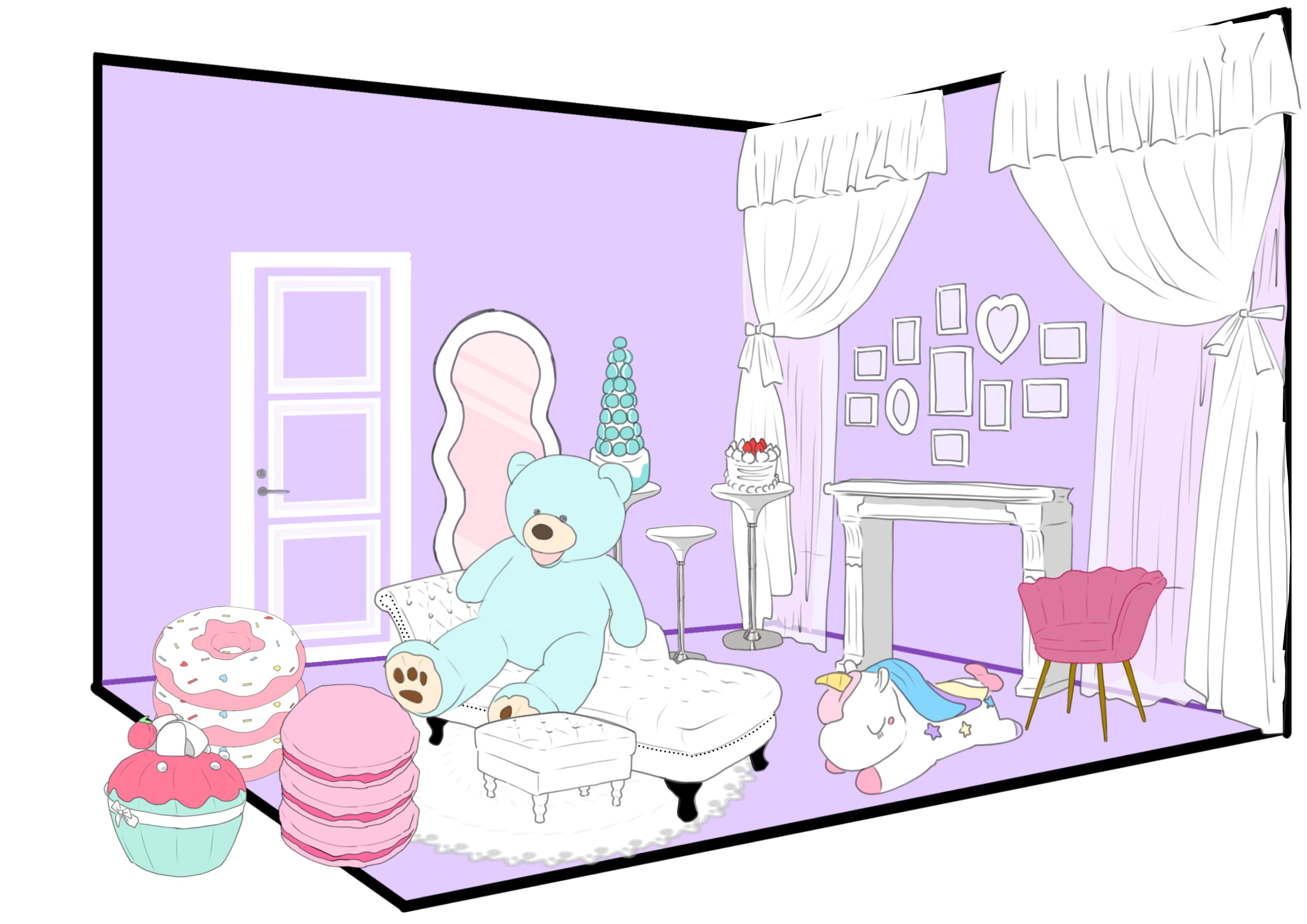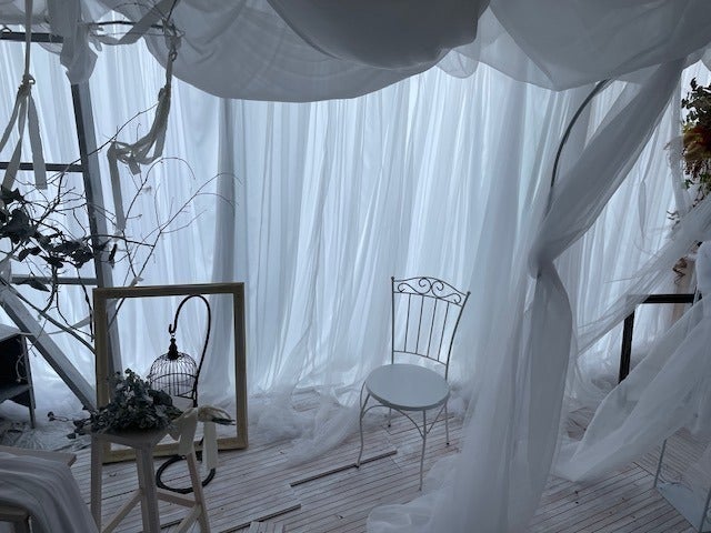こちらは左側と雰囲気を変え、フリルカーテンやマカロンタワーなどで