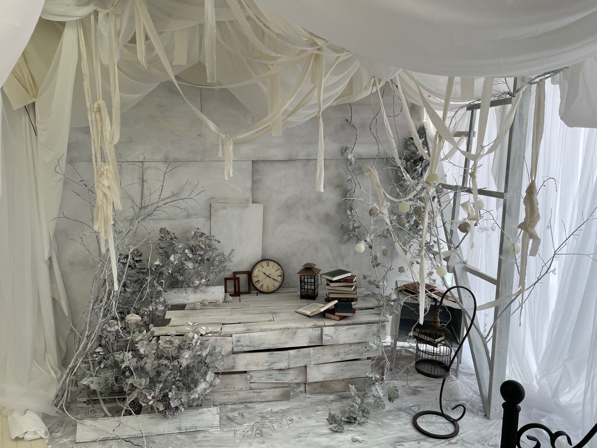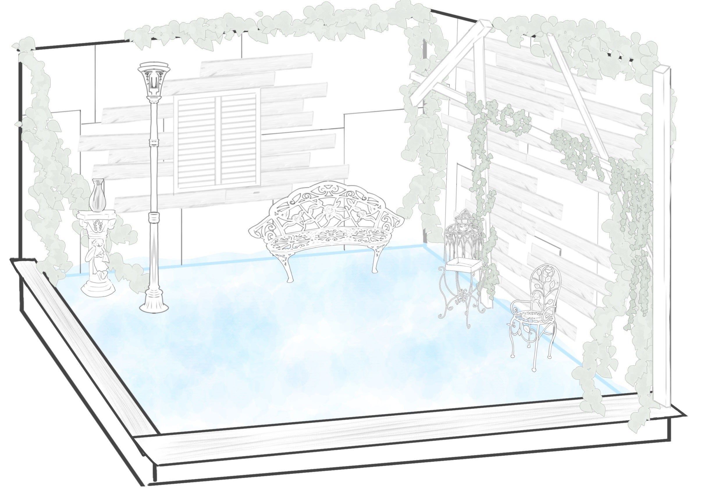 既存のプールを活かしたまま、白を基調とした廃材や植物類で廃墟感要素を加えます。