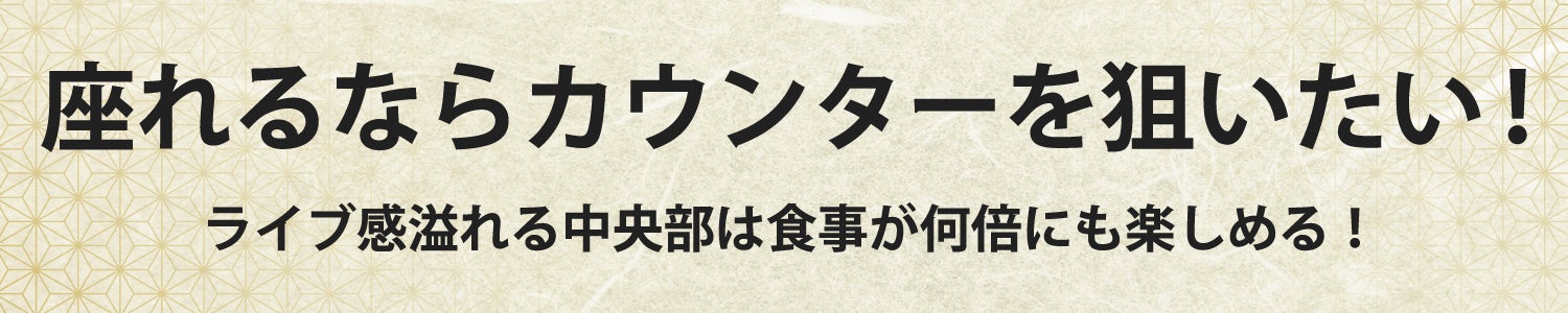 中心部にはフルオープンのキッチンスペースとカウンター席。1人の時はもちろん、グループで来てもカウンターを狙いたくなる贅沢な空間です。また、団体様が安心してお食事できる宴会席もご用意していますので、さまざまなシーンでお楽しみいただけます。