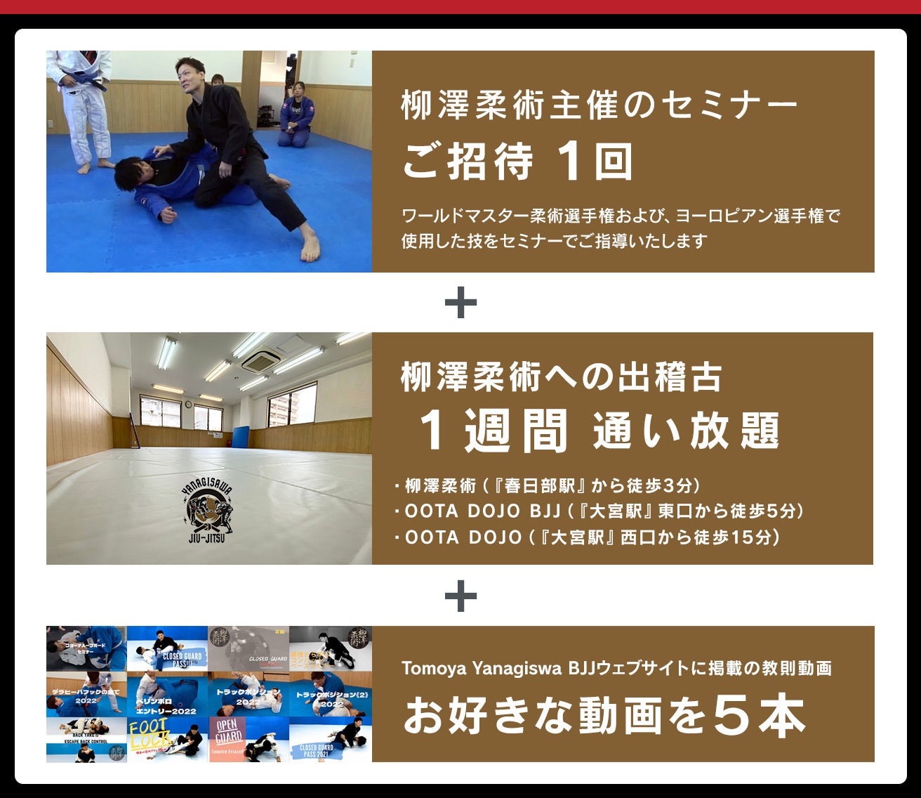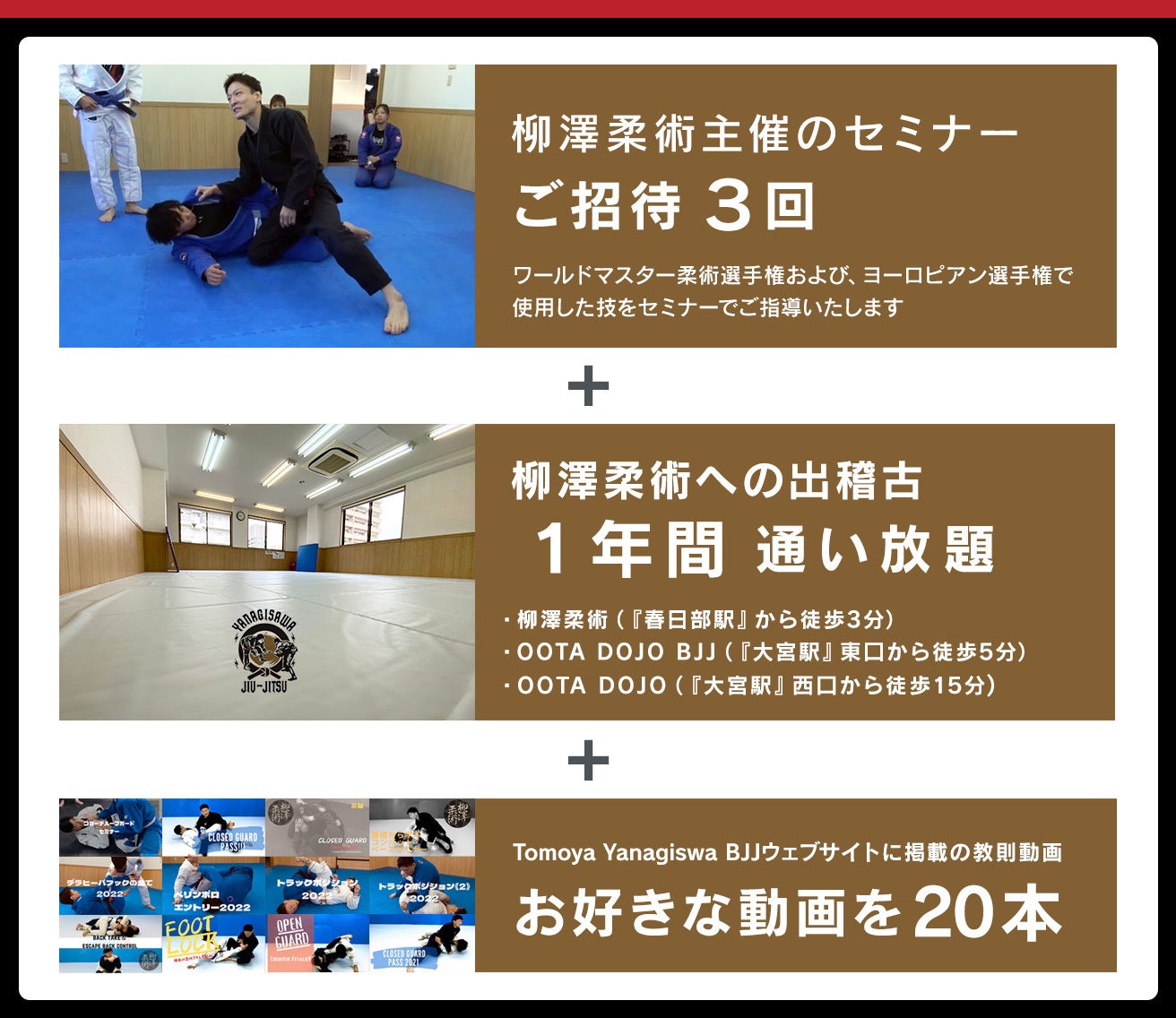 柳澤柔術主催のセミナーへのご招待(3回)と、埼玉県 春日部駅前の柳澤柔術、大宮駅東口のOOTA DOJO BJJ、大宮駅西口のOOTA DOJOへの出稽古が1年間 通い放題。