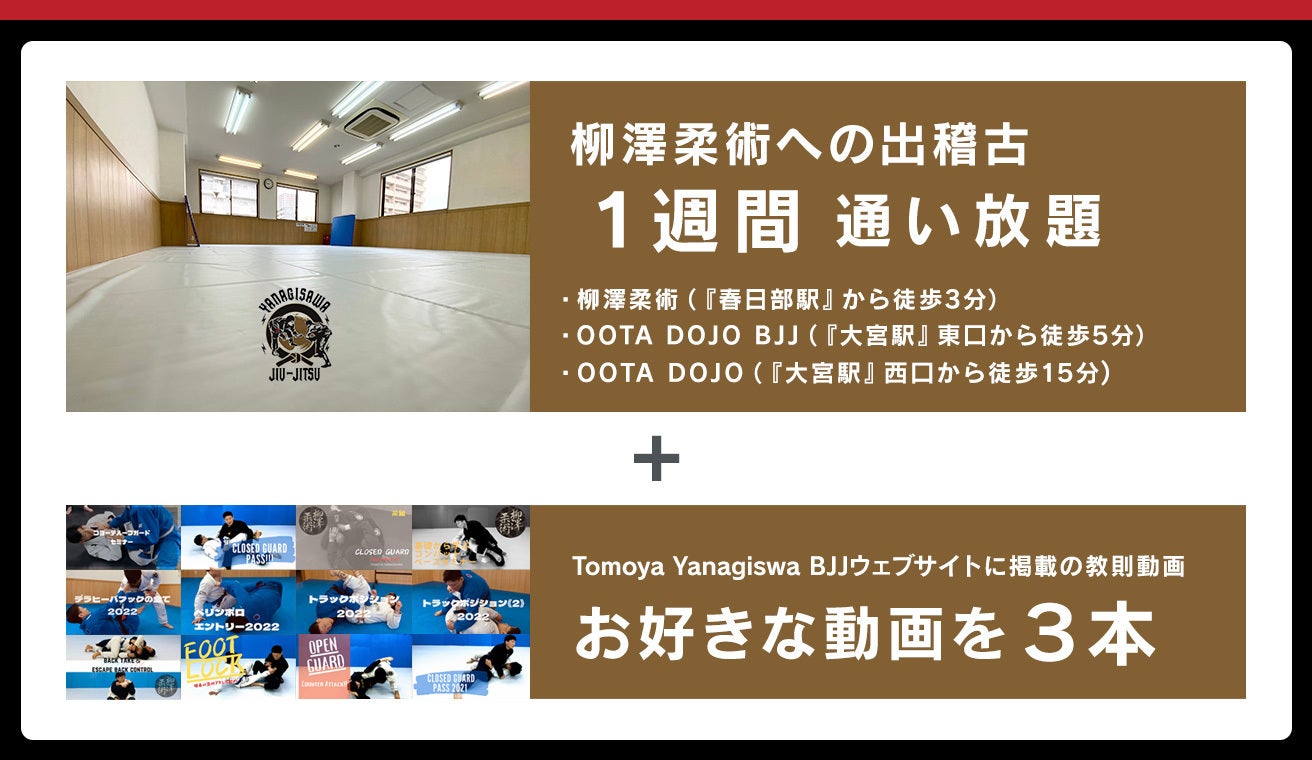 柳澤柔術主催のセミナーへのご招待(1回)と、埼玉県 春日部駅前の柳澤柔術、大宮駅東口のOOTA DOJO BJJ、大宮駅西口のOOTA DOJOへの出稽古が1週間 通い放題。