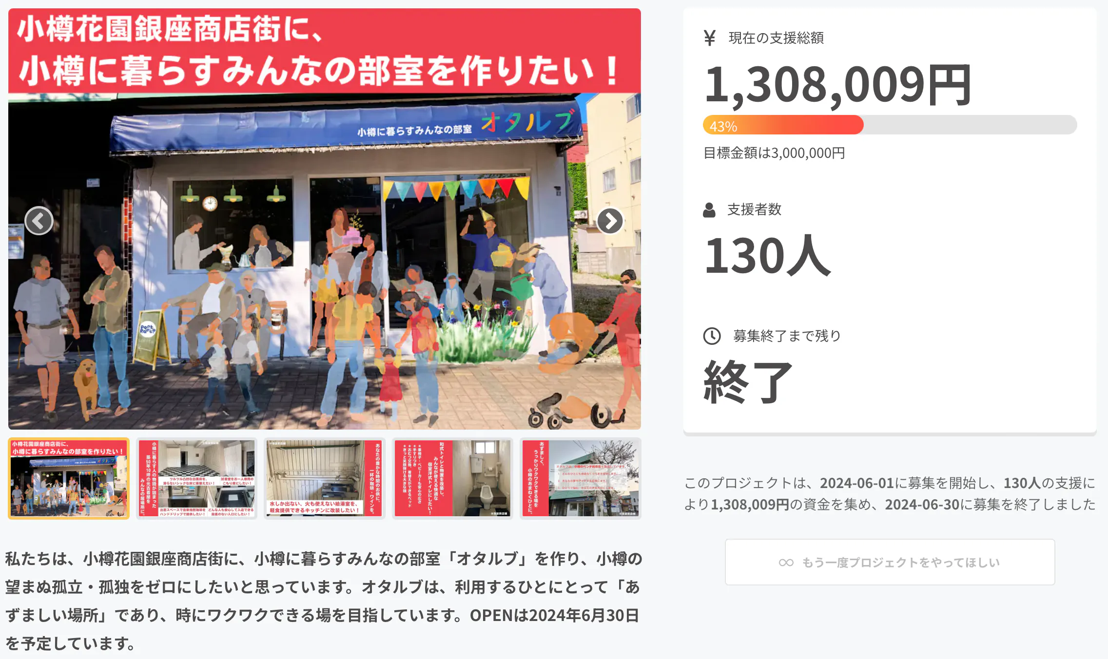 本プロジェクトのクラウドファンディングの結果ですが、目標金額:3,000,000円には届きませんでしたが、支援者数:130名の方々に、支援総額:1,308,009円をご支援いただきました。皆様よりいただいたご支援額は、オタルブの活動費などとして大切に使わせていただきます。本当にありがとうございました。