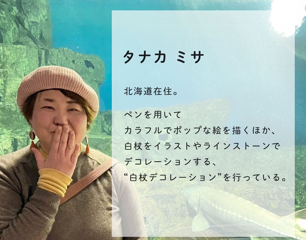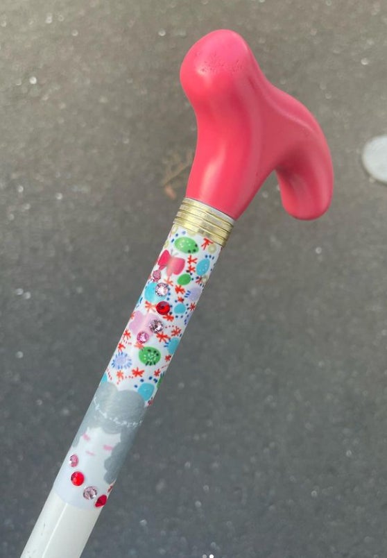 ↑自身の白杖に白杖デコレーションを施した写真。