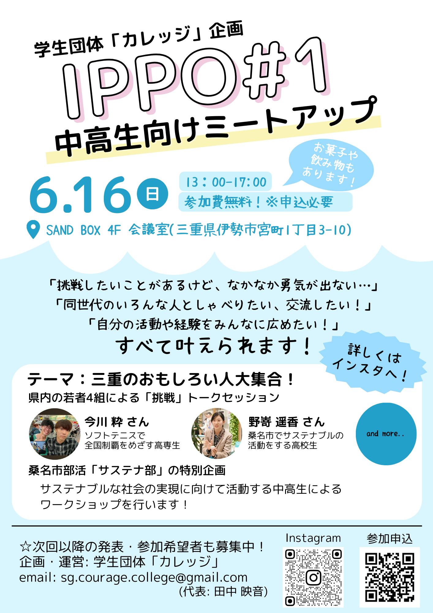 今回の「IPPO#1」では、「三重の面白い人大集合!」をテーマに掲げ、県内の高校生数名に15分程度のプレゼンをしてもらいます。
