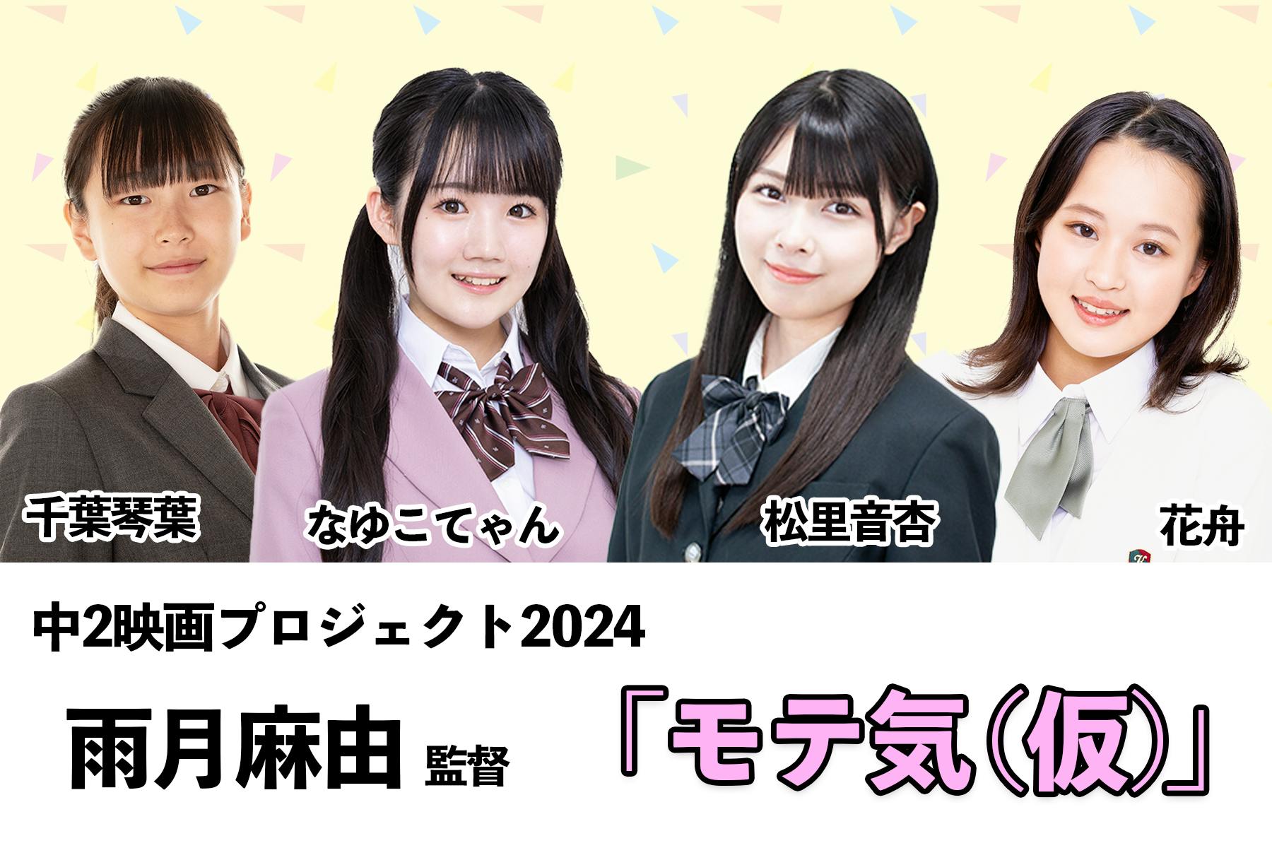 2024/04/25 21:30(仮)ではあるんですが「モテ期」から「モテ気」に変更しました!こちらの作品は「モテ期」に向けた女の子の努力を届けられたらと思います!■プロットとある男子に恋心を寄せる、自分に自信がない内気な主人公。ある日整形について調べていたところ、恋愛コンサルティングをうたう怪しげなサイトで、「公式 LINEに登録するだけで、モテ期 1 週間プレゼント」をゲットしてしまう。次の日の朝、鏡を見た主人公は、とても可愛くなった自分を見て驚く。そして今までにない異性からの視線を感じるようになり、人生初の異性からの告白も!しかし、想いを寄せる男子からのアプローチはなく、なんとか期間中にものにしたいとあがく主人公。そして毎日公式 LINE で、恋愛相談に乗ってもらうように。公式 LINEからは、主人公の行動を見ているかのように、アドバイスのLINEが届く。1週間をかけて、メイクやお洒落も上達し、どんどん自己肯定感が高まっていく主人公。モテ期最終日、想いを寄せる男子と距離を詰めてきた主人公は、ついに彼へ告白を試みるが...?!■松里音杏(まつさと おとあ)昨年のTOKYO青春映画祭では「最優秀助演賞受賞」を受賞。今年は千寿製薬「マイティア」さんのCMにも出演!中2映画プロジェクト・アイドル部から選抜メンバーに!まさに努力女子!https://otoa1107.notion.site/otoa1107/Otoa-Matsusato-e57e0e25efaf4348b59b0ac0b1e5847b生年月日:2008年11月7日身長:162cm出身地:愛媛県血液型:A2022年:映画「カオル・コンプレックス」出演2022年:中2映画プロジェクト・アイドル部活動開始2022年:映画「懐胎新書」主題歌「TOKYO DRAMATIC〜単純ってピュアだよ!〜」配信リリース2023年:2ndオリジナル曲「隣のクラスのあいつ / ドキッ!こういうのが恋なの?」配信リリース2023年:映画「グー然じゃないピース」出演*TOKYO青春映画祭2023・最優秀助演賞受賞・準グランプリ受賞2023年:映画「グー然じゃないピース」主題歌「High Five!」配信リリース2023年:アルバム「中2映画プロジェクト2023・主題歌集」CDリリース2024年:千寿製薬「マイティア」瞳のチカラ #01 夫婦の瞳 篇2024年:「Qoo」CMソング「ザ☆ピ~ス!(Qoo Ver.)」歌唱■なゆこてゃん昨年から中2映画プロジェクトに参加。インフルエンサーとしての実績も着々と!そしてアイドル部2期生から選抜メンバーに大抜擢の【特技:SNS】な努力女子!https://lit.link/nayuconayuco生年月日:2007/7/31身長:160cm出身:三重県血液型:O2023年:中2映画プロジェクト・アイドル部活動開始2023年:TOKYO青春映画祭「主題歌ステージ」出演2023年:ライブ「針尾ありさ・The Last Live!」(初台Doors)出演2023年:映画「そんなバカな! 」主題歌 「愛してるより上」配信リリース2023年:映画「グー然じゃないピース」主題歌「High Five!」配信リリース2023年:アルバム「中2映画プロジェクト2023・主題歌集」CDリリース2024年:中2映画プロジェクト・アイドル部選抜グループ準備中<インフルエンサー活動歴>・&Prismシャンプー&トリートメント商品紹介・ミニVO5商品紹介・OBP楽曲紹介・ドン・キーホーテ限定、サンリオアイテム新商品・加工・編集アプリSNOW新エフェクト紹介*こちらの作品への出演者は5名を予定してます。随時更新予定。■監督は「雨月麻由」が担当。■意気込みコメント今回、私にとって初めての映画制作となります。観た人の印象に残る素敵な作品に仕上げられたらと思いますので、よろしくお願いいたします!■プロフィール1991年1月24日生まれ。千葉県出身。早稲田大学在学中2010年より、独学でDTMによる音楽活動を始め、処女作『魔女の円舞曲』がニコニコ動画にて11万再生以上を記録し、ランキング入り。2017年よりカラオケDAMの音源クリエイターとして活動。2018年以降は、ライブ活動や楽曲提供などで音楽活動を開始。同時にかわさきFMの音楽番組「Music way! way!」のメインパーソナリティを努める。2021年、オリジナル楽曲『消えない証』が「ワールドマスターズゲームズ2021関西リハーサル大会兼第10回Beach Volley in 南あわじ大会」の公式応援ソングとなる。■つんく♂さんから中2映画監督へ中2映画の作品作りも早4年目。今年大抜擢されました監督の皆様、大変お世話になります。特に、今回初めて中2映画制作にチャレンジいただく監督は三人ということで、過去にない新鮮な作品が期待されます。短編映画って簡単そうで実は難しい。何が難しいかって、映画って実は無駄な時間に意味あいが隠されてたり、後の伏線回収のネタ振りだったりするところに醍醐味ってあったりします。ですが短編ゆえにそういう無駄そうで意味のある部分にたっぷり時間をかけることが難しいわけです。でも、逆を言えば⻘春ってそれくらい凄まじいスピードで毎日が進んでいきます。中2映画は、そのスピード感を表現するにふさわしいのかもしれませんよ!大いに期待しちゃうわけです。そして⻑編は笠原監督が担当するわけですが、つんく♂サロン初期メンバーとして、すいも甘いも知り尽くした存在。過去のいろんな経験を活かして素晴らしい作品を完成させて