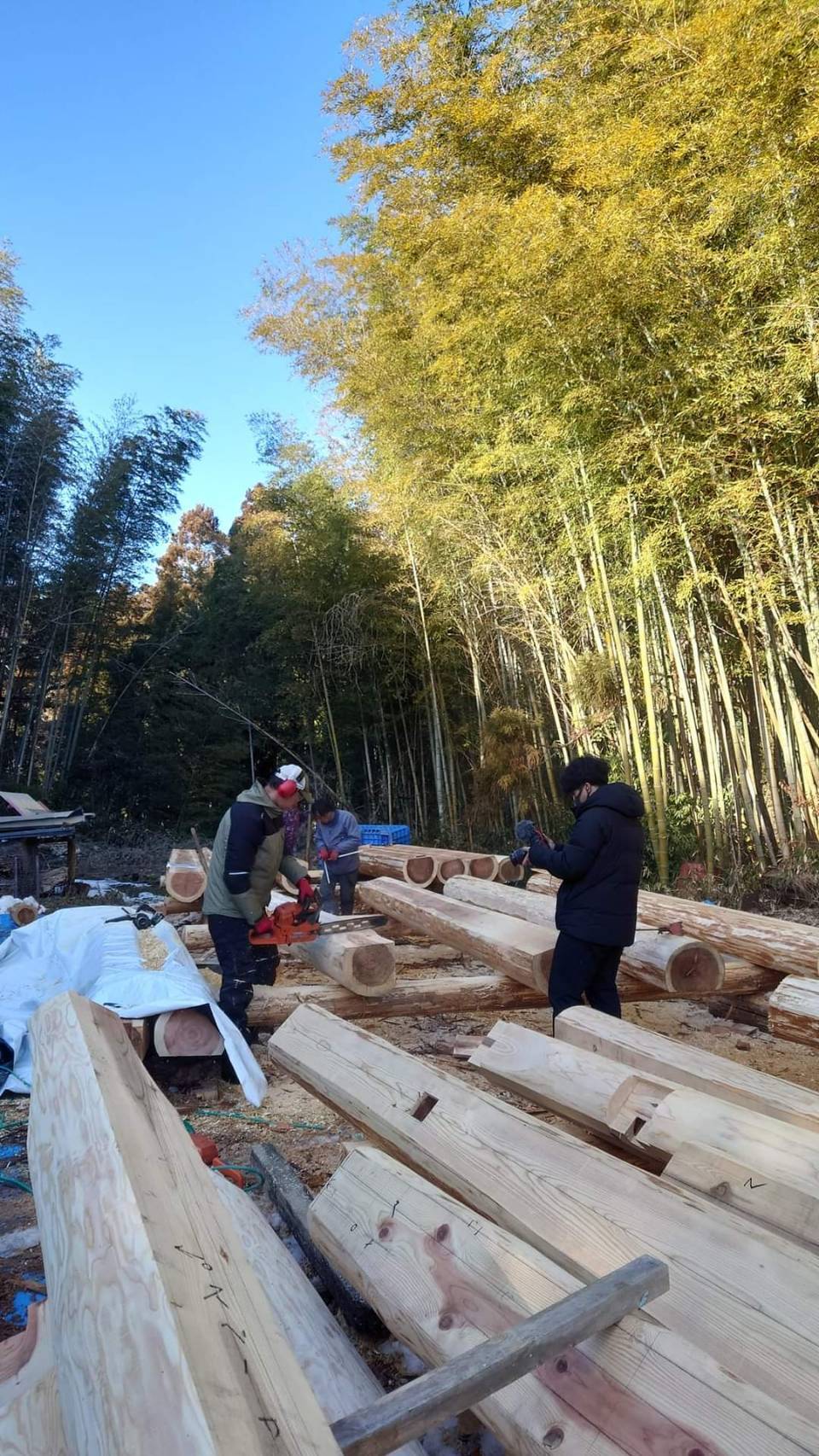 (チェンソーでハンドカットのログ材加工)