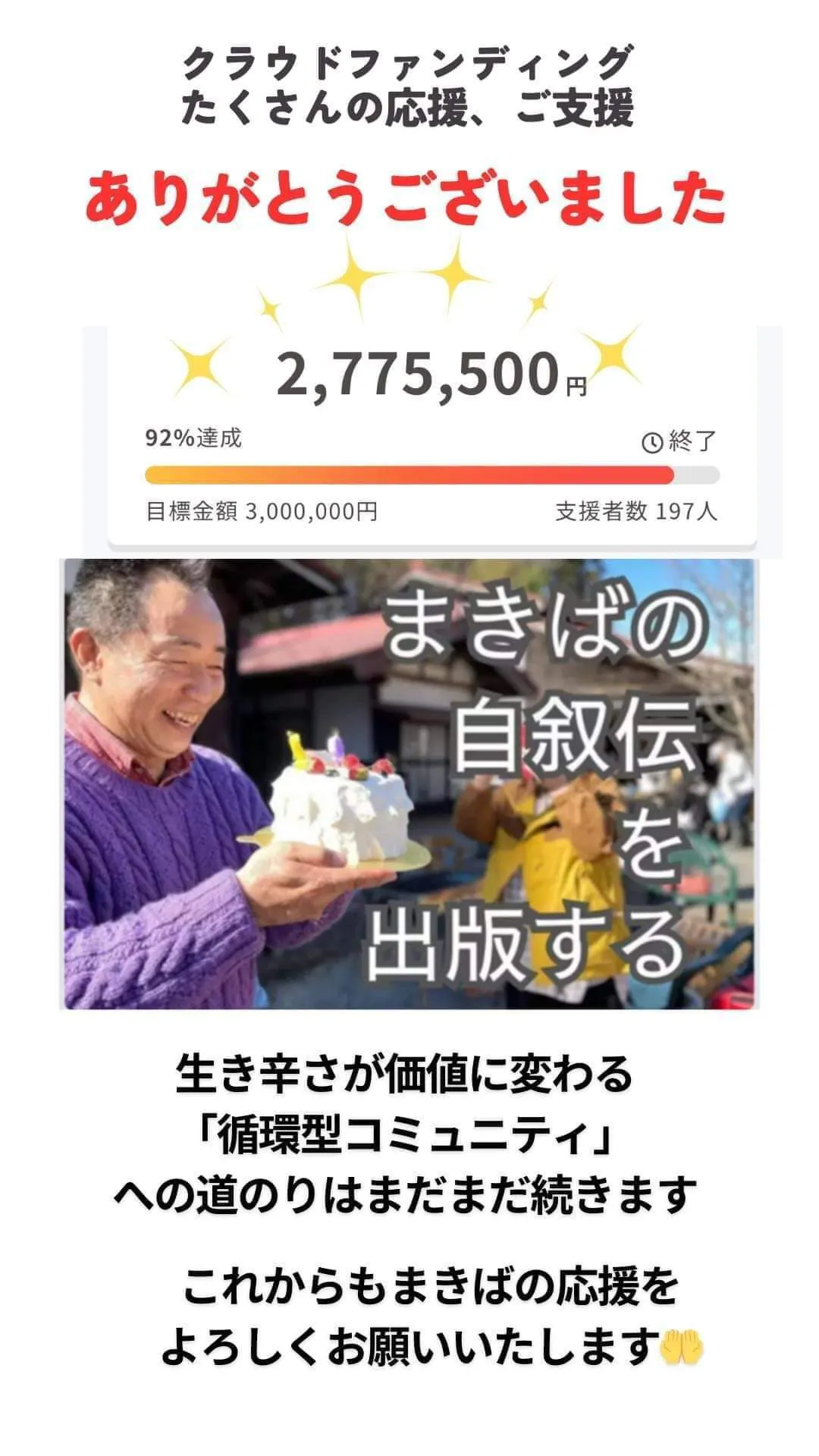 このプロジェクトは、2024/05/09に募集を開始し、 197人の支援により 2,775,500円の資金を集め、 2024/06/20に募集を終了しました