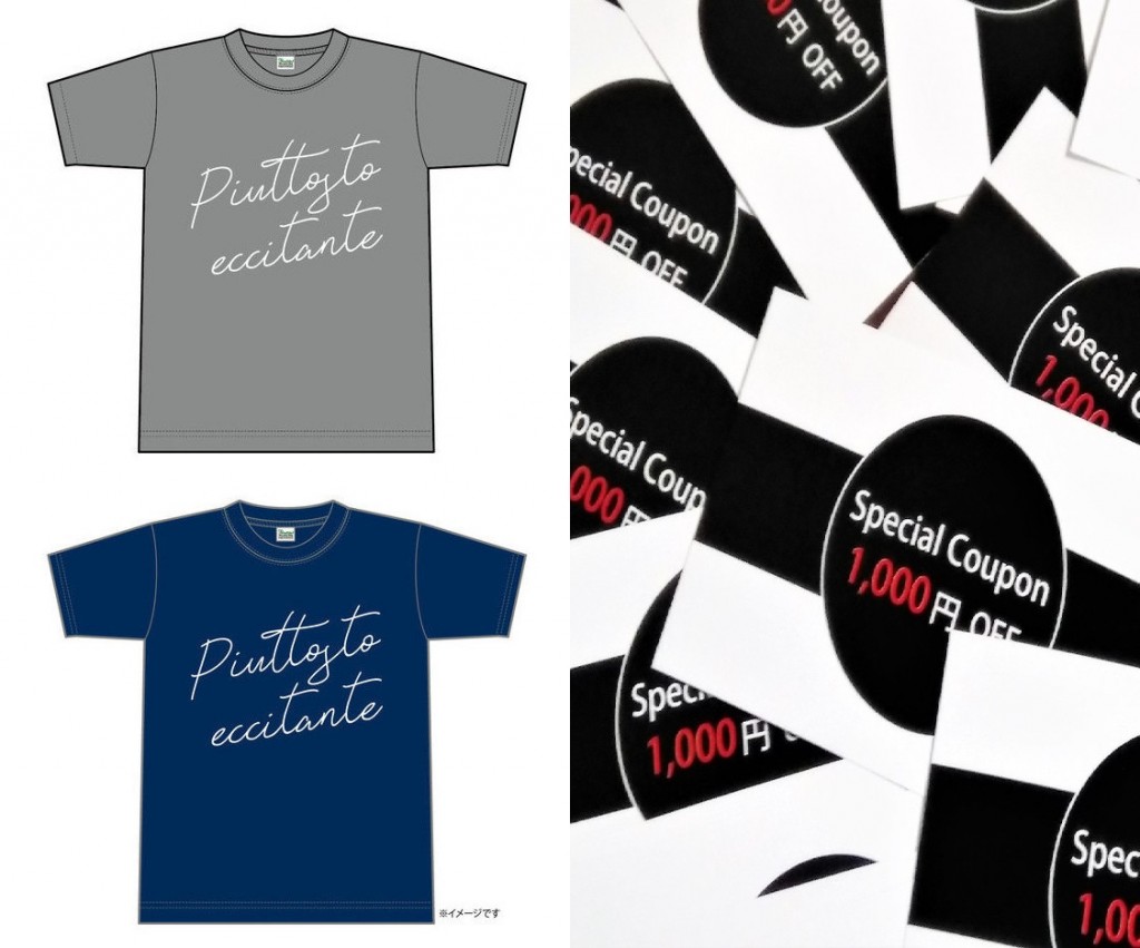 「Piuttosto eccitante」というメッセージがプリントされているオルジナルTシャツ。