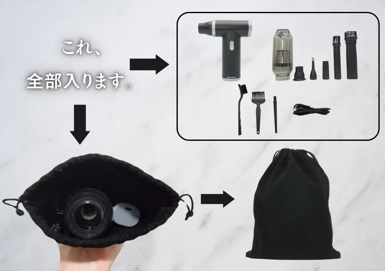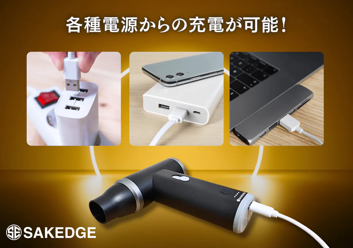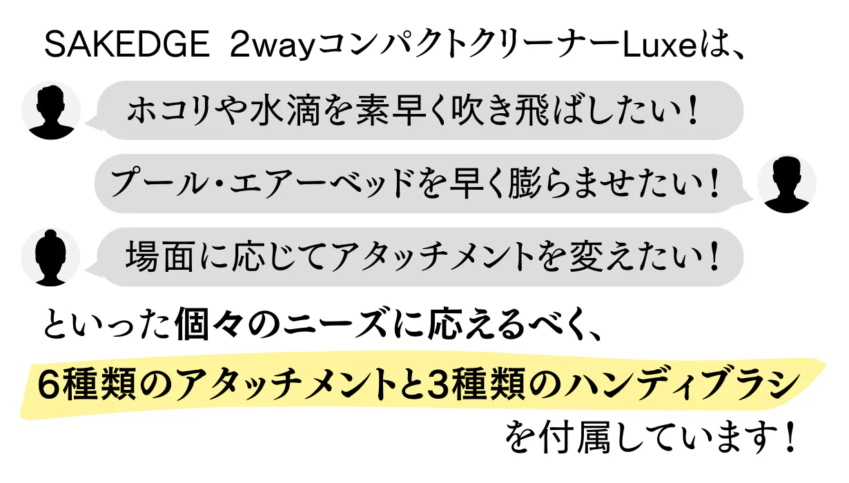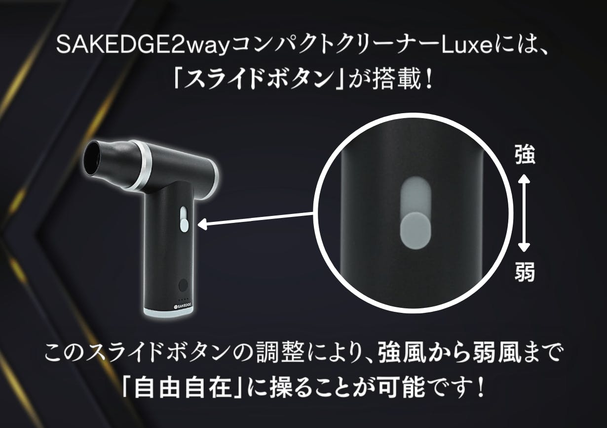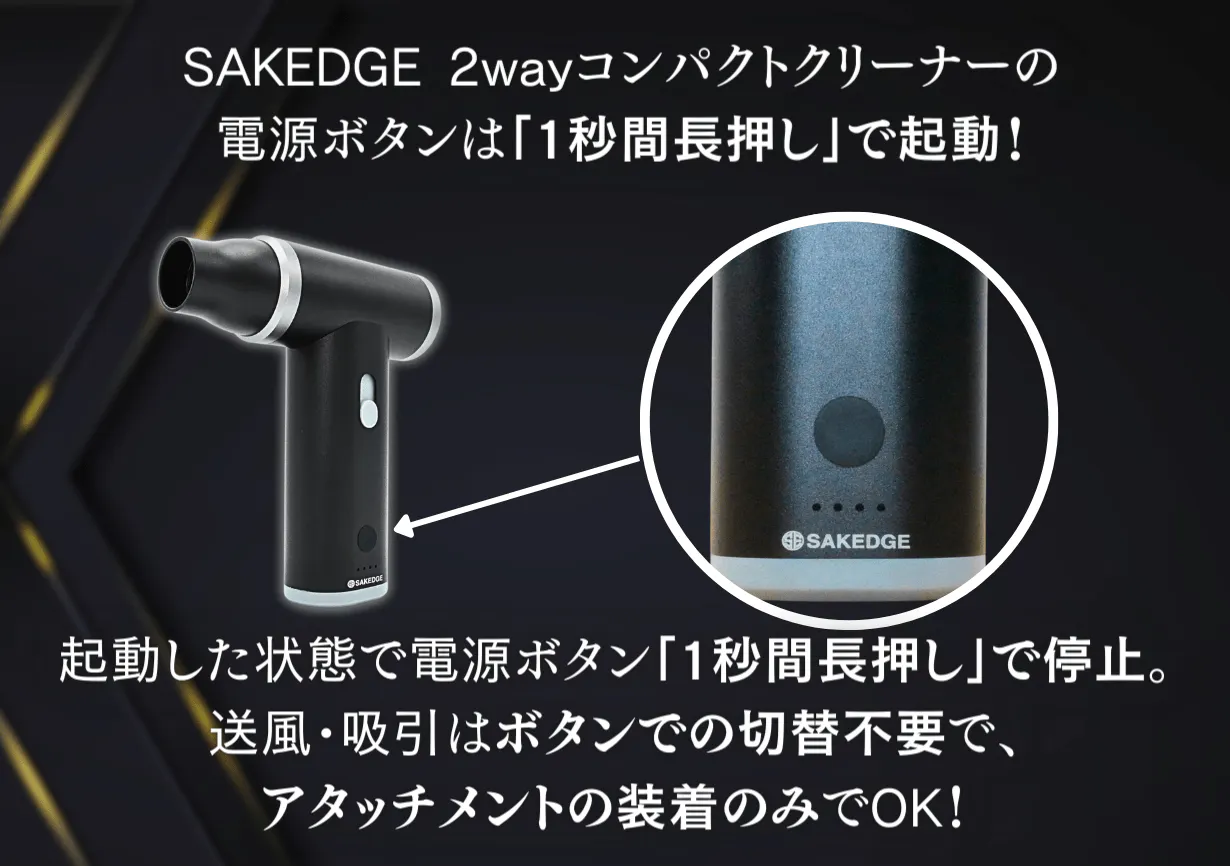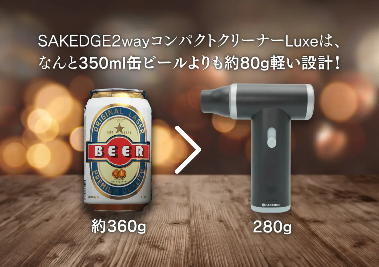 今回お届けする「SAKEDGE 2wayコンパクトクリーナーLuxe」は、お家や車内の細かい掃除や、洗車後の水滴飛ばし、空気入れなどが簡単にでき、尚且つ見た目の高級感のある製品を探し求め出会った出来上がった商品です。