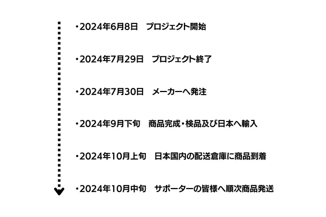 ※本文中に記載させていただいたスケジュールは、あくまでプロジェクト公開時点の予定です。クラウドファンディングの性質上、配送遅延のおそれがございます。原則として、配送遅延に伴うご支援のキャンセルはできませんが、リターン配送予定月から3ヶ月を超えた場合には、希望者に限りキャンセルにて対応させていただきます。