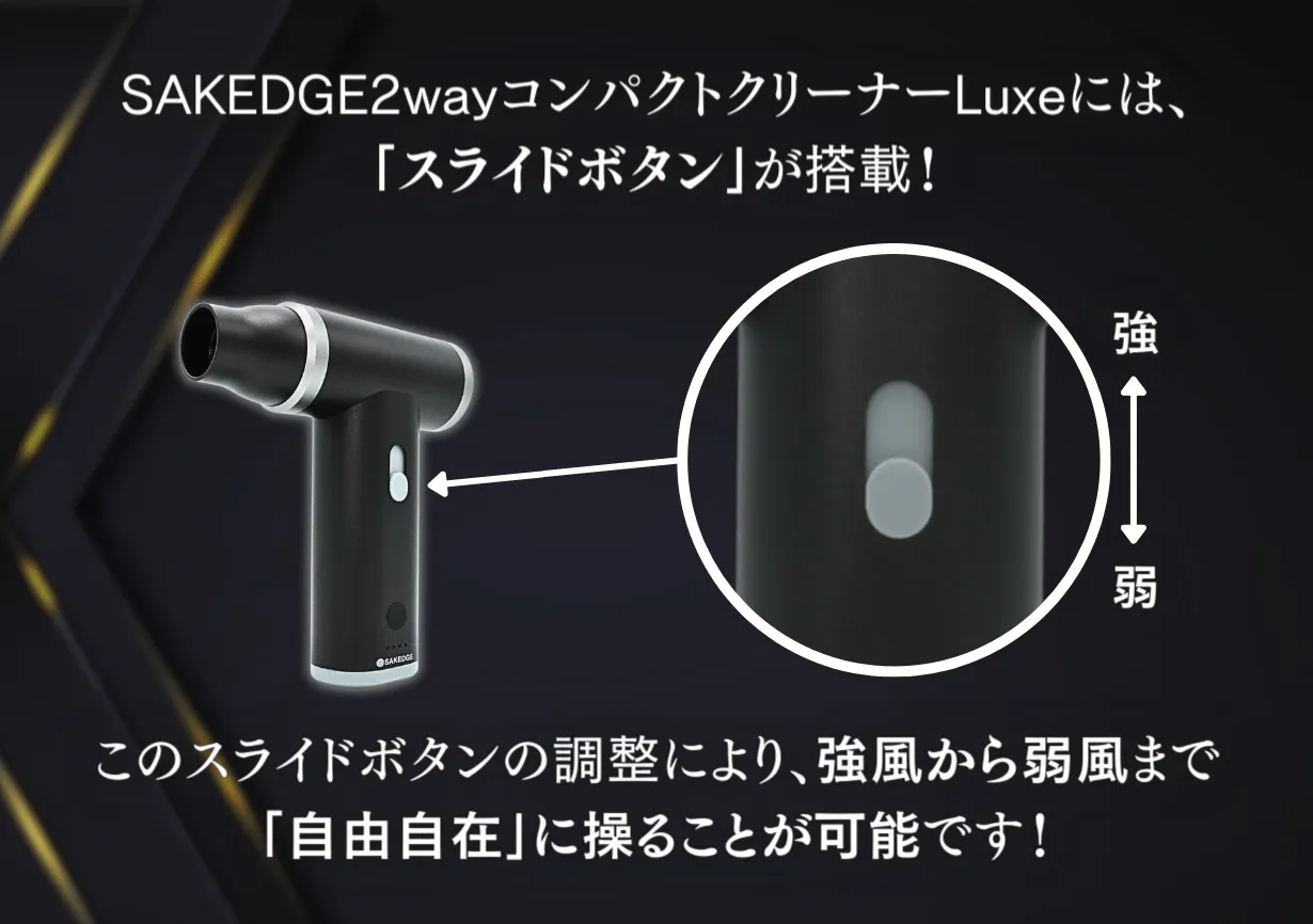 そして、SAKEGDE 2wayコンパクトクリーナーLuxeの他クリーナーと違う非常に便利な特徴とも言えるのが、スライドボタンの操作でモーター回転を22,000RPMから110,000RPMまで変速できる無段階変速機能。