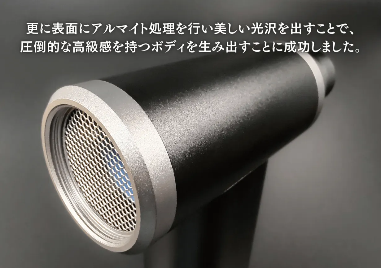 ご覧いただいて分かる通り、アルミニウム合金にアルマイト処理が施されており、美しい光沢を持った洗練されたデザインとなっております。