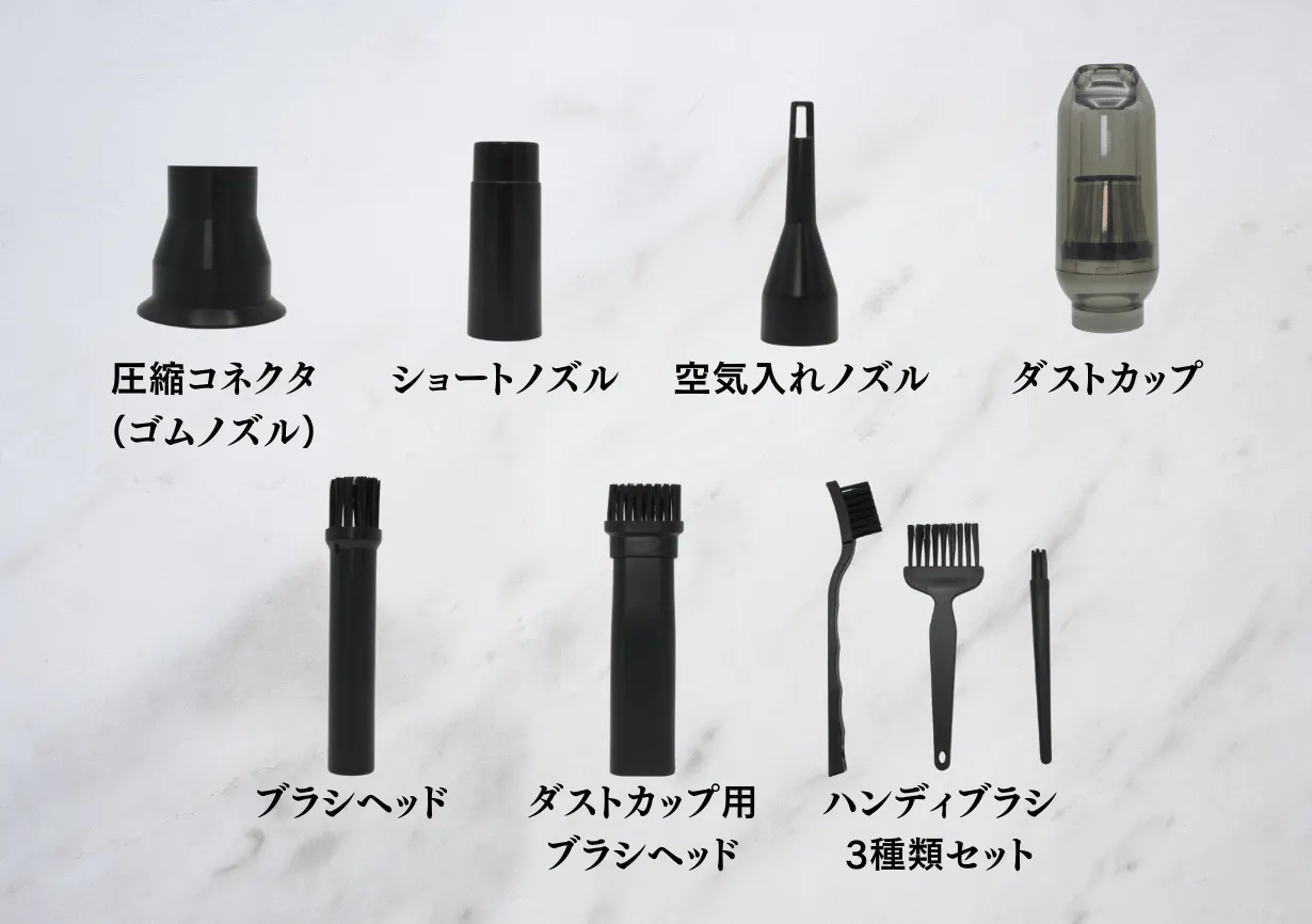 同梱物:付替用ノズル6種類・ハンディブラシ3種類・USB Type-Cケーブル1本・専用ポーチ