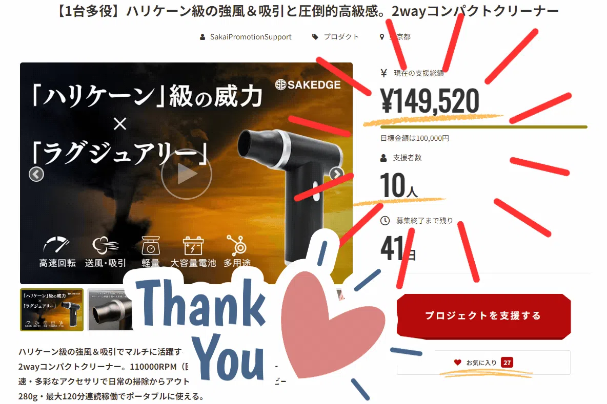 先日よりスタートいたしました「SAKEDGE 2wayコンパクトクリーナーLuxe」プロジェクトは、皆様の温かいご支援のおかげで無事に目標ご支援額を達成することができました!