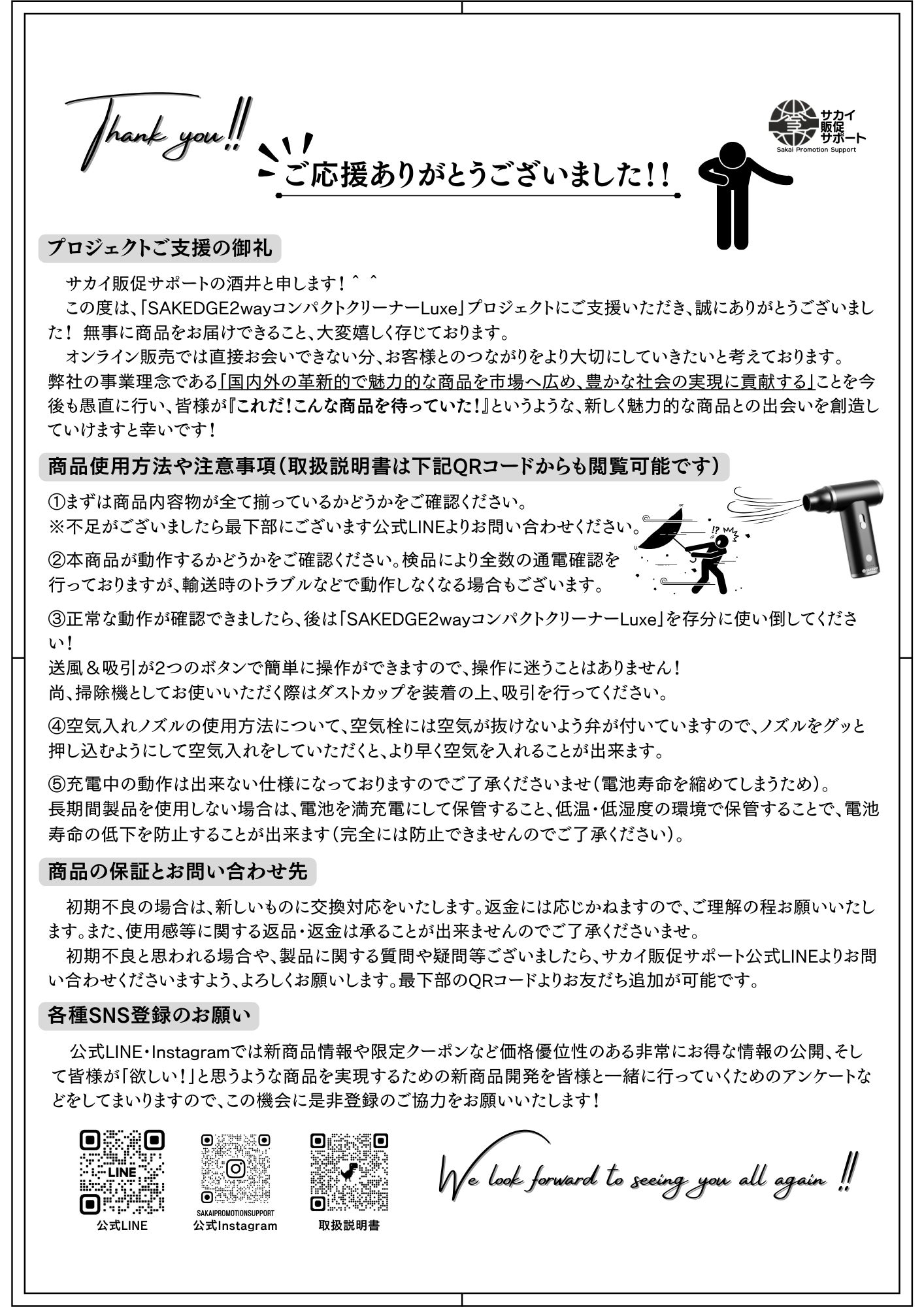 【SAKEDGE 2wayコンパクトクリーナーLuxeプロジェクトご支援者の皆さまへ】