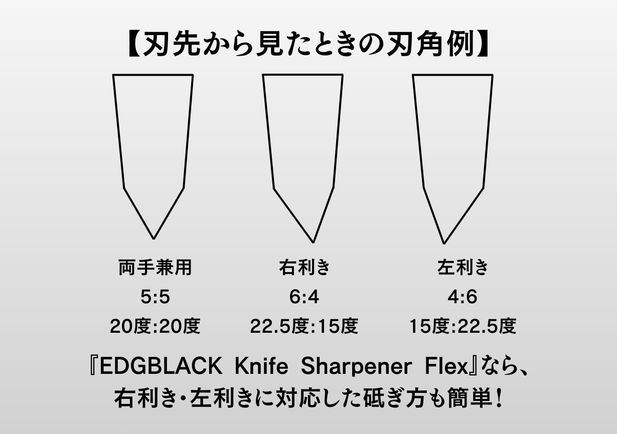 本商品で利き手に合わせて包丁を砥ぐ場合は、下図のように右利き(6:4)なら22.5度:15度や15度:10度、左利き(4:6)なら15度:22.5度や10度:15度程度でおおよそ利き手に合った理想的な角度に砥ぐことが出来ます。