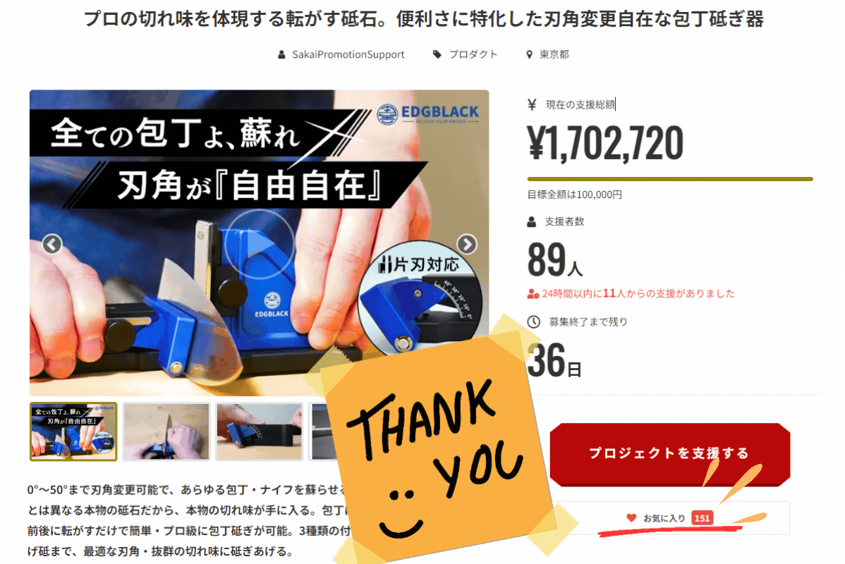 先日スタート致しました「EDGBLACK Knife Sharpener Flex」プロジェクトは、皆様の温かい、いや『熱い』ご支援のおかげで支援総額170万円突破&支援者数100名を目前とすることができました!